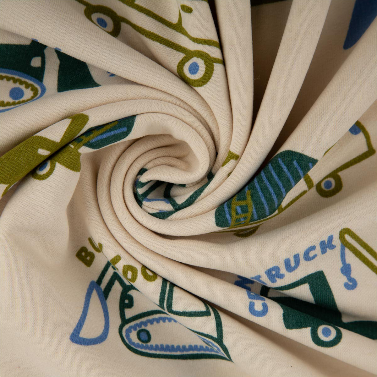Sweatstoff Soft Sweat aus Baumwolle Baufahrzeuge ecru blau grün 1,48m Breite
