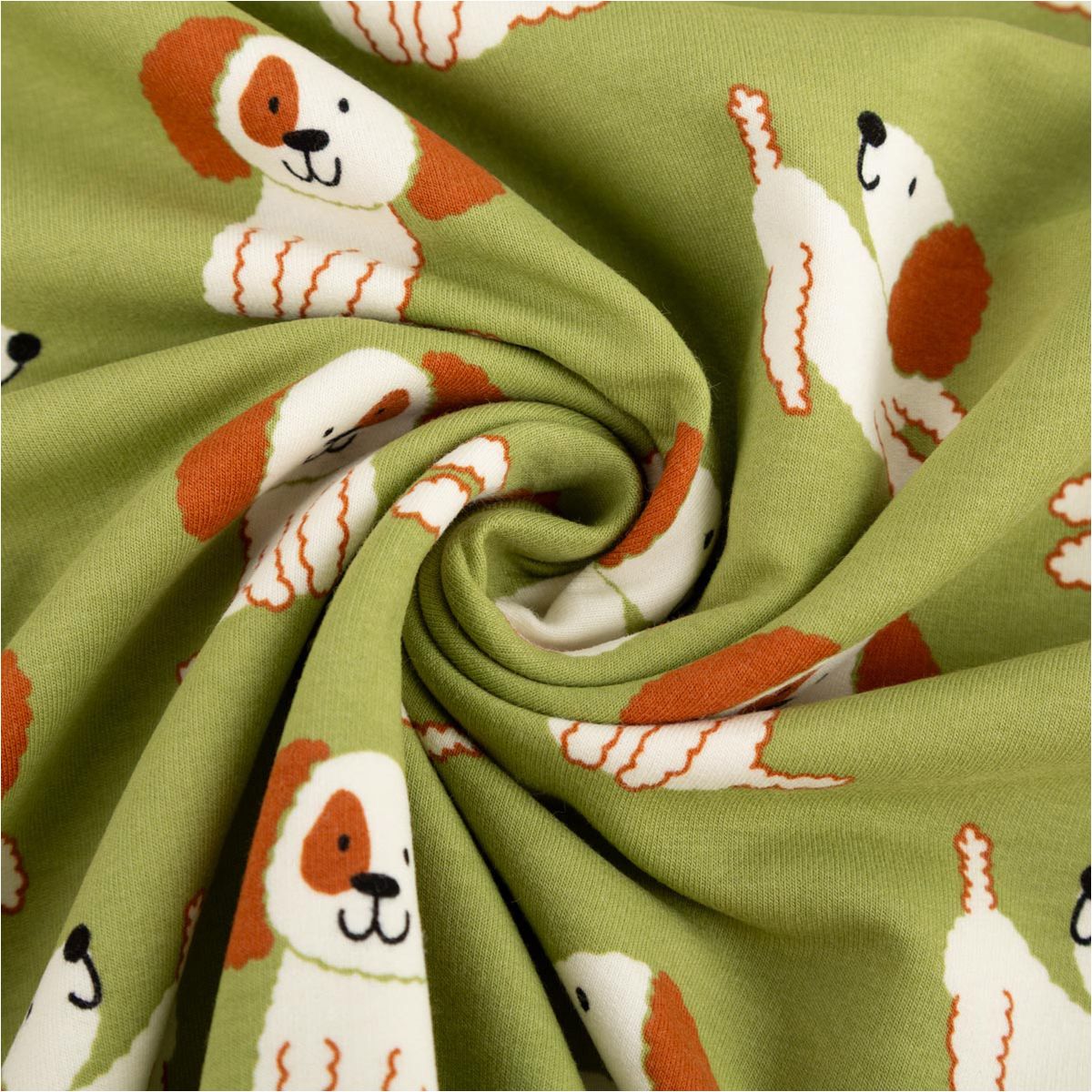 Dieser hochwertige Soft Sweat Stoff mit Hunde-Motiven ist Teil der beliebten Poppy Fabrics Kollektion und eignet sich ideal für gemütliche Nähprojekte für Kinder und Erwachsene. Auf grünem Grund sind niedliche Hunde in Ecru- und Brauntönen verteilt – verspielt, zeitlos und wunderbar kombinierbar.
