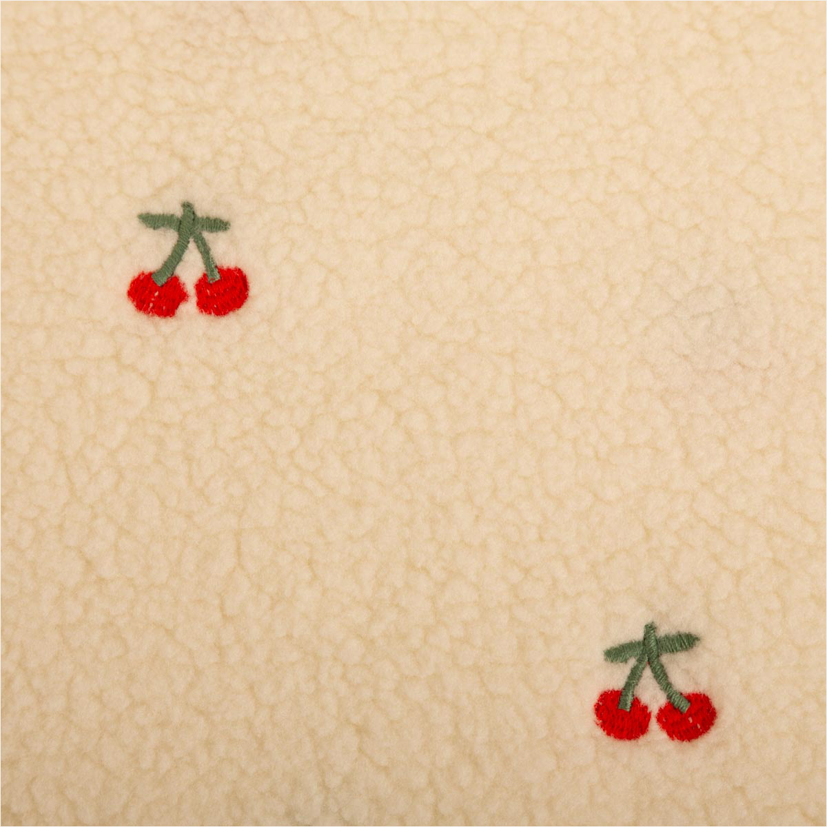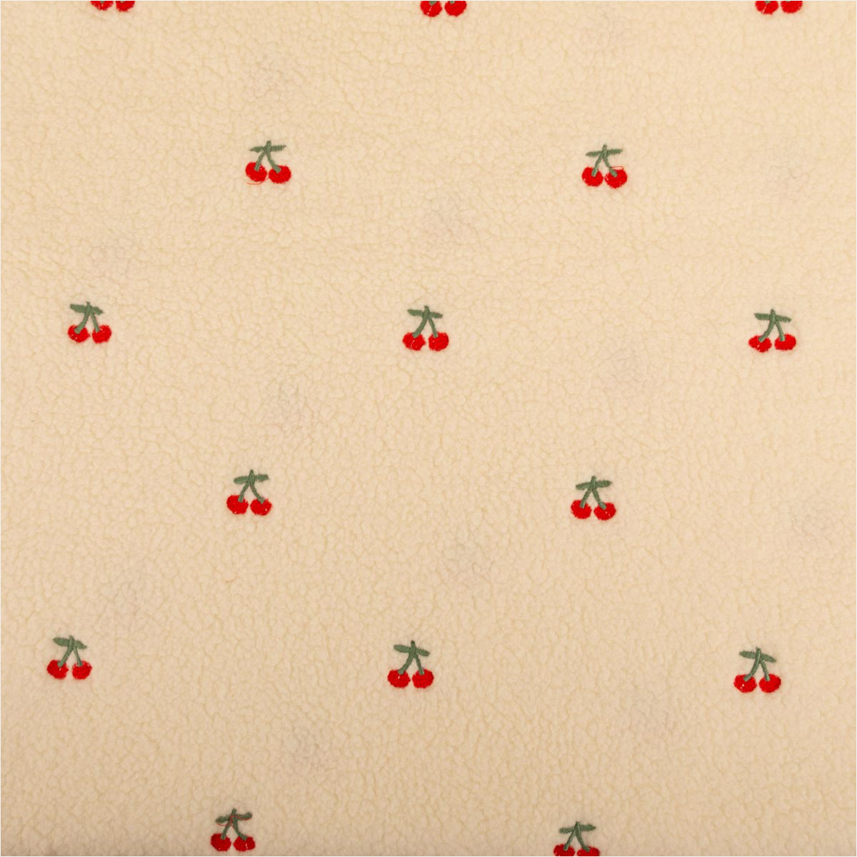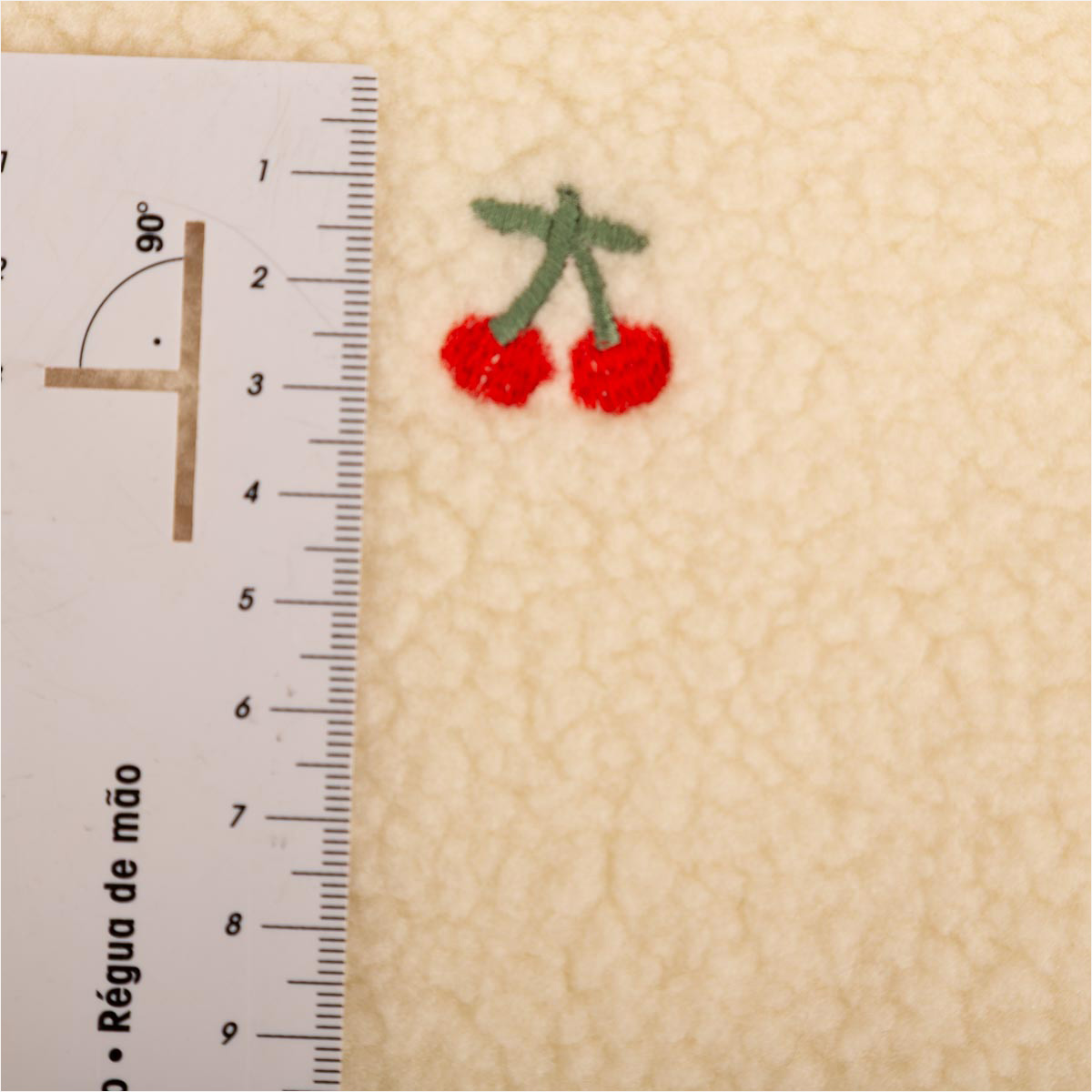 Flauschiger Teddystoff Bouclé in wollweiß mit süßer Kirsch-Stickerei – perfekt für gemütliche Nähprojekte