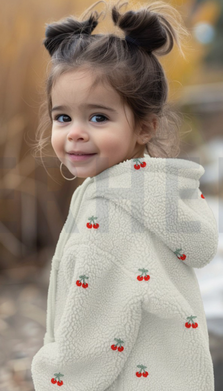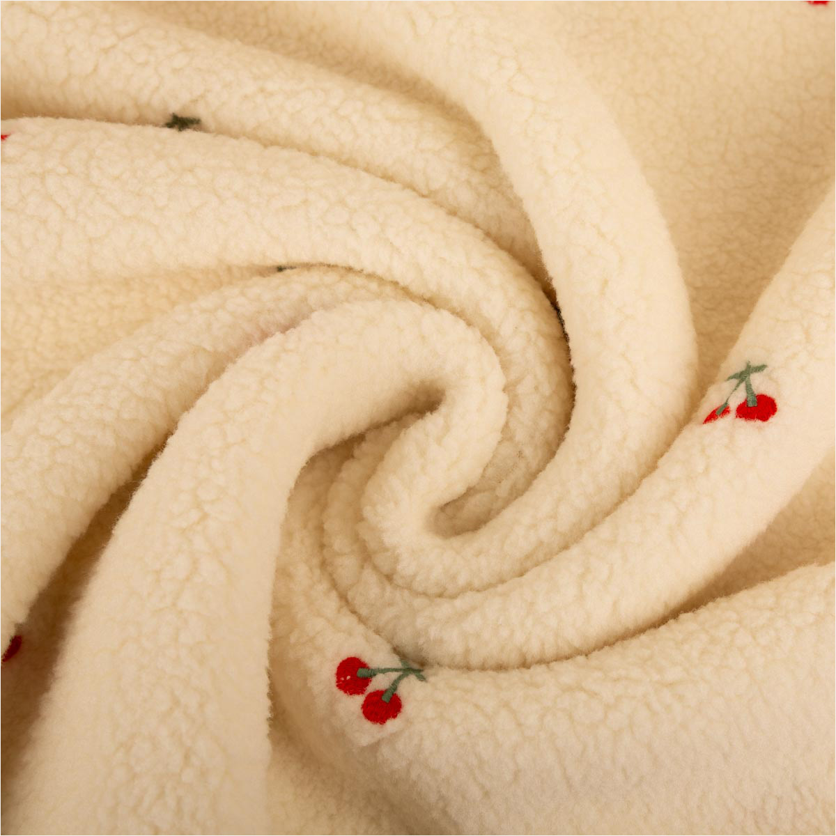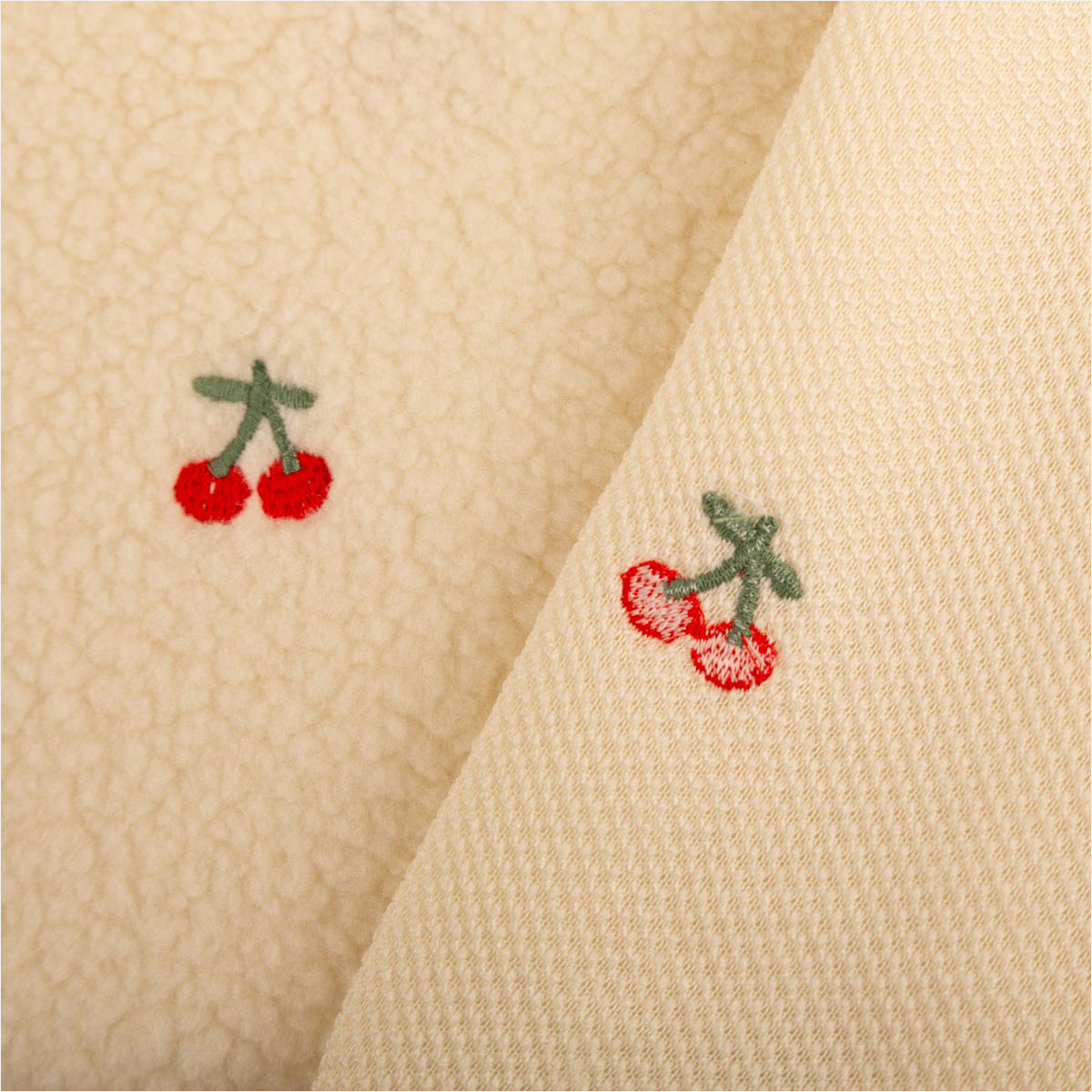 Flauschiger Teddystoff Bouclé in wollweiß mit süßer Kirsch-Stickerei – perfekt für gemütliche Nähprojekte