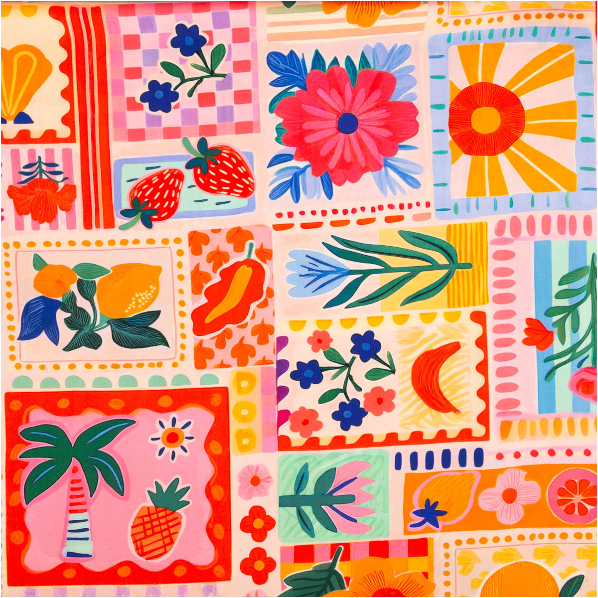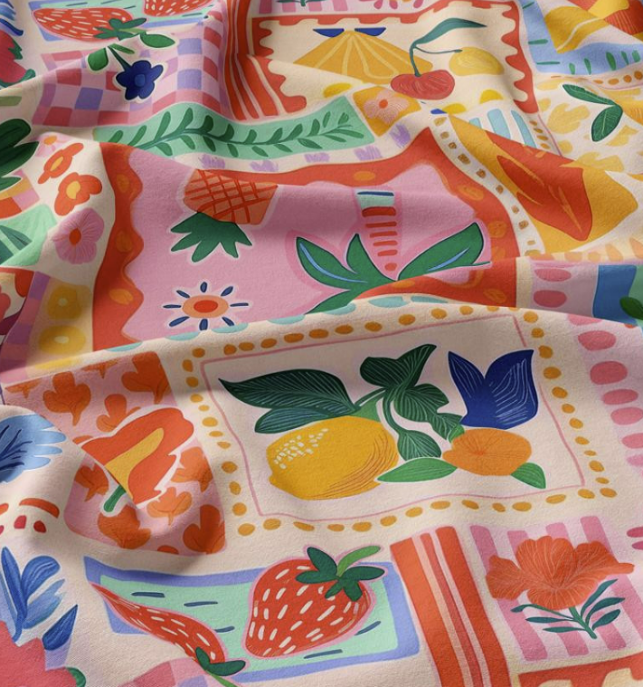 Dieser hochwertige Viskose Stoff für Bekleidung begeistert mit einem farbenfrohen Patchwork-Design voller Früchte und floraler Elemente. Das exklusive französische Dessin verleiht dem Stoff einen modernen, frischen Look und macht ihn zur perfekten Wahl für sommerliche Nähprojekte mit individuellem Charakter.