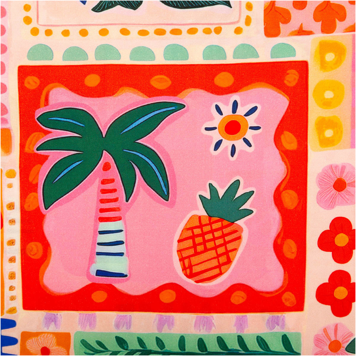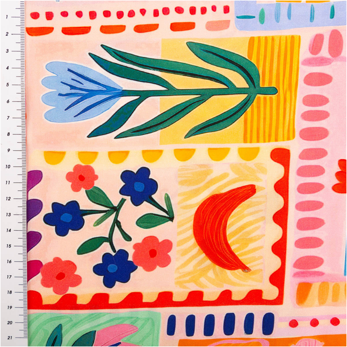 Leichter Viskose Stoff für sommerliche Bekleidung mit farbenfrohem Patchwork-Früchte-Design