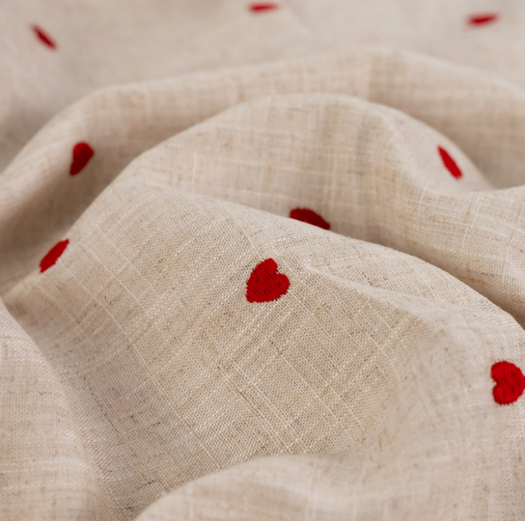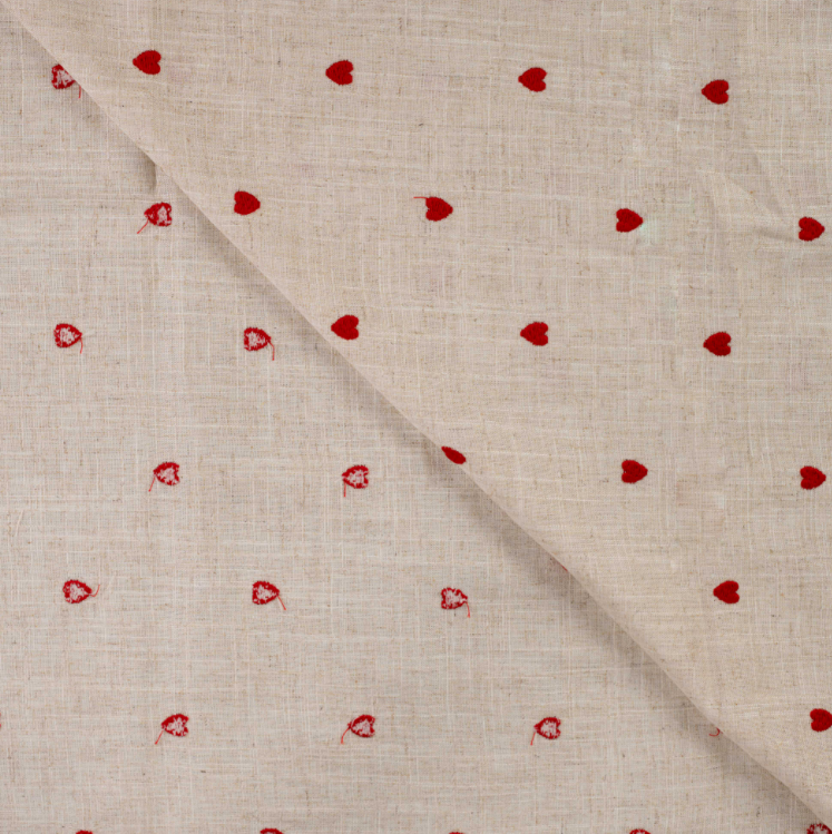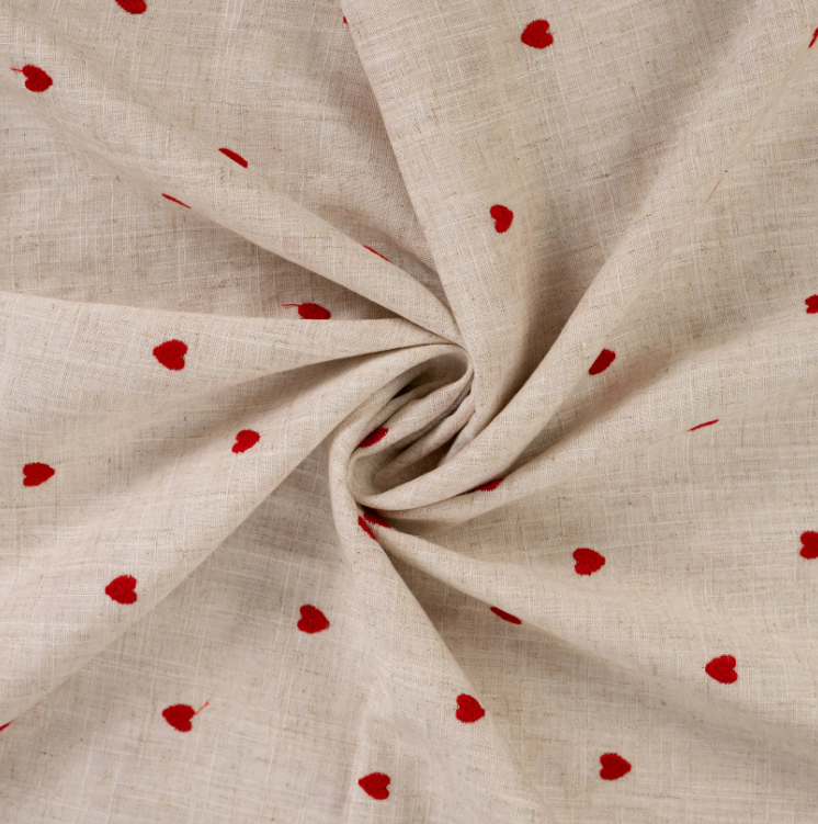 Dieser bestickte Viskose-Leinenstoff begeistert durch seine natürliche Optik und die liebevolle Stickerei mit kleinen roten Herzchen. Der naturfarbene Grund wirkt ruhig und hochwertig, während die feinen Herzmotive einen charmanten, verspielten Akzent setzen – perfekt für sommerliche Nähprojekte mit besonderem Charakter.
