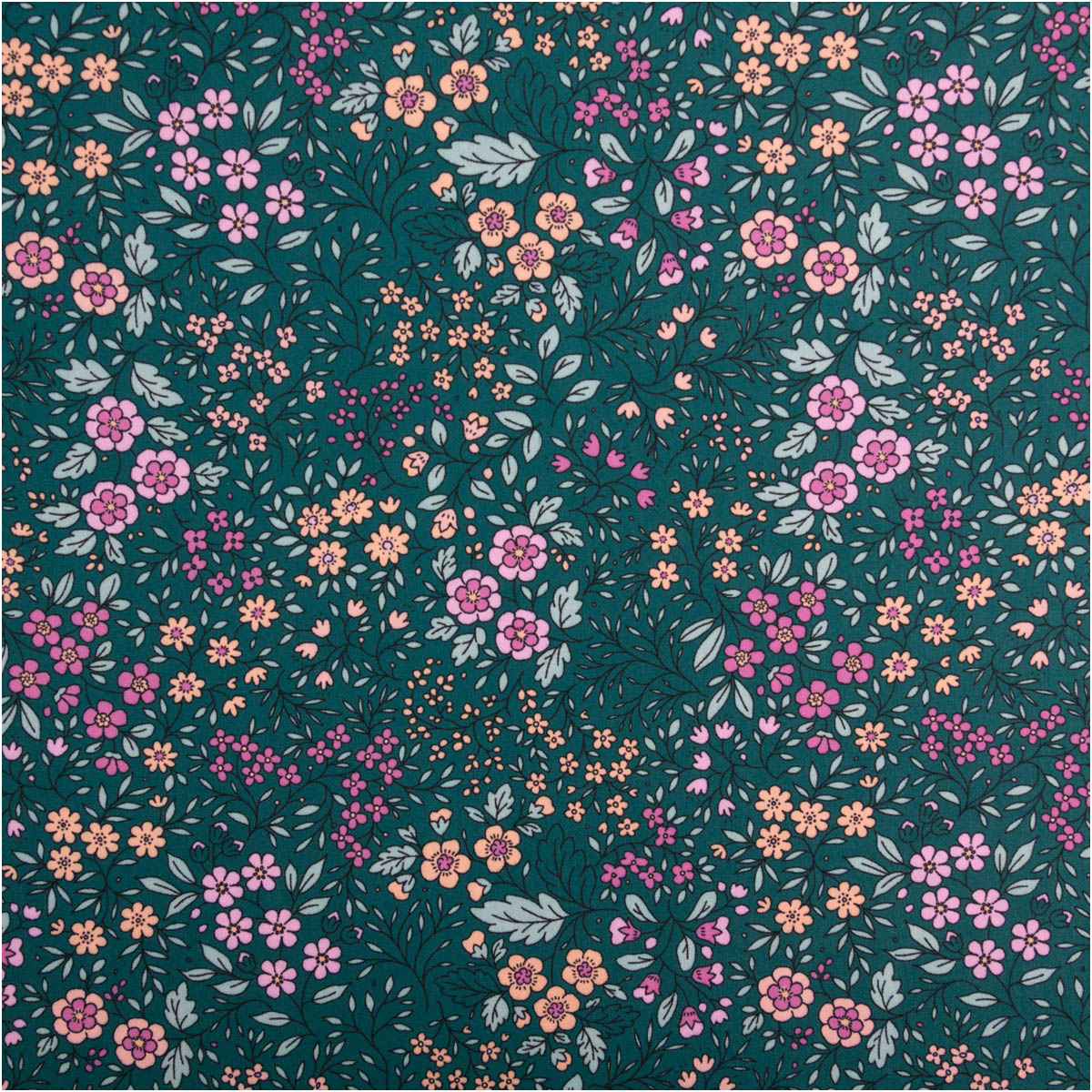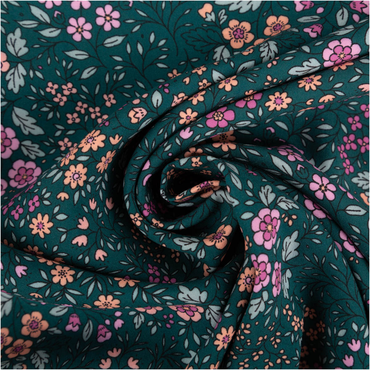 Das feine Blümchenmuster in verschiedenen Grüntönen sorgt für ein ruhiges, ausgewogenes Gesamtbild. Die floralen Elemente wirken dezent und stilvoll, sodass sich der Stoff sowohl für schlichte als auch für verspielte Schnitte eignet.