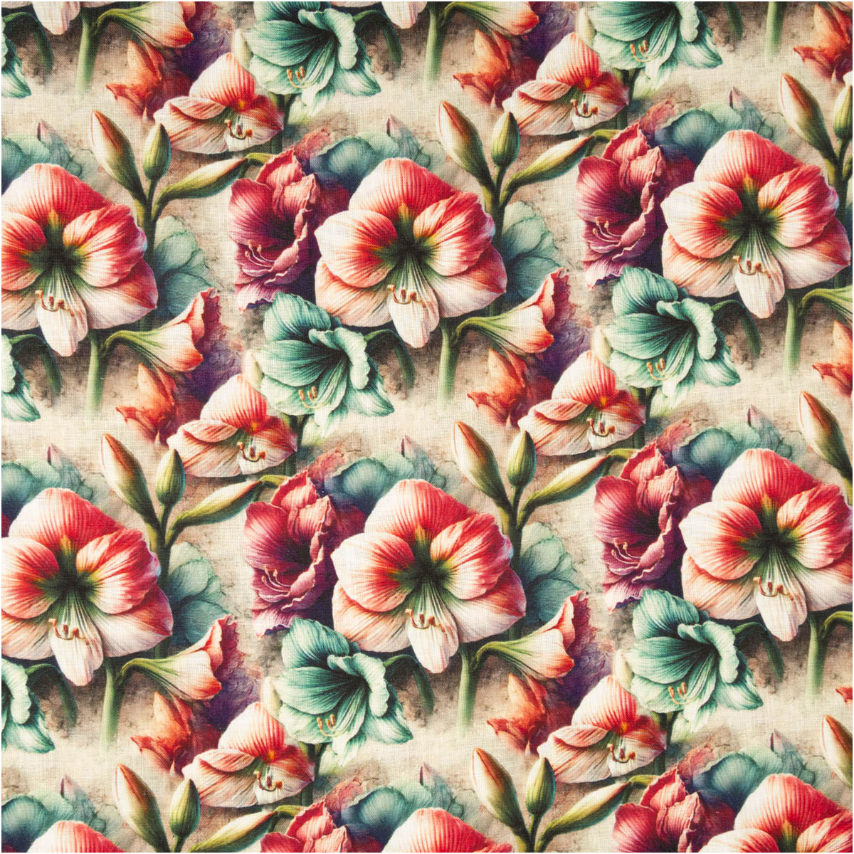Modernes Blumen-Dessin (Azaleen/„Alazela“): naturfarbener Grund mit rosa, türkis und grünen Nuancen