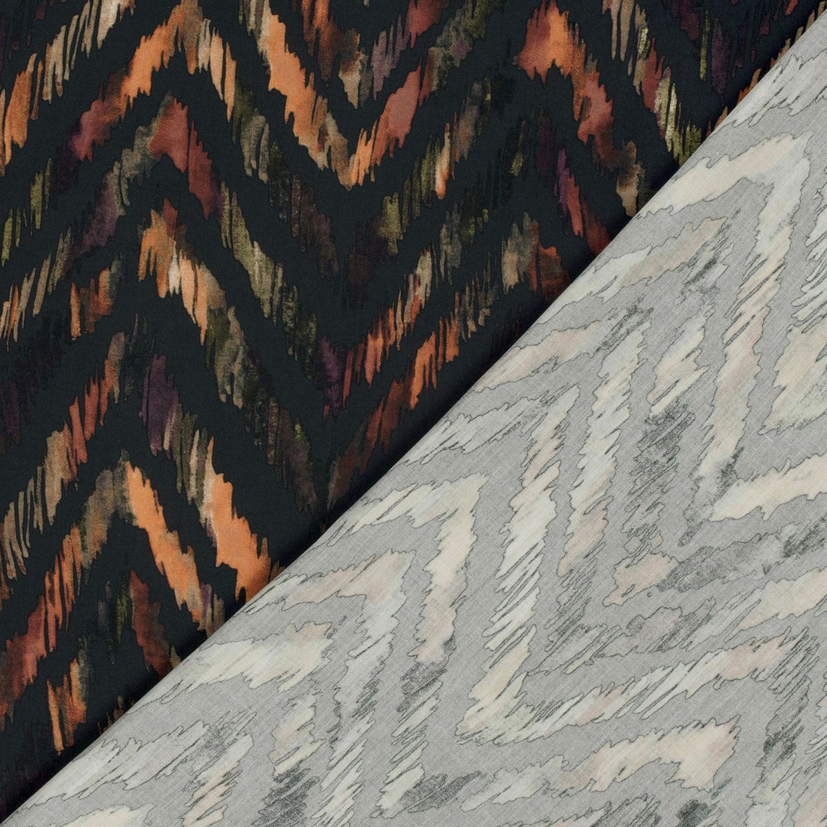 Optik: abstraktes Chevron/Zickzack-Dessin in Dunkelgrau mit erdigen Akzenten