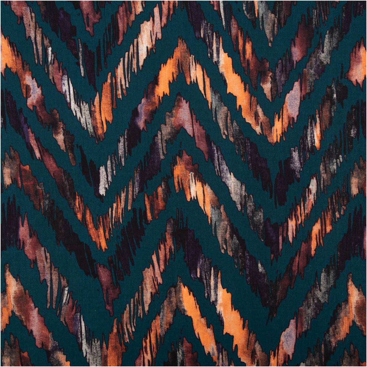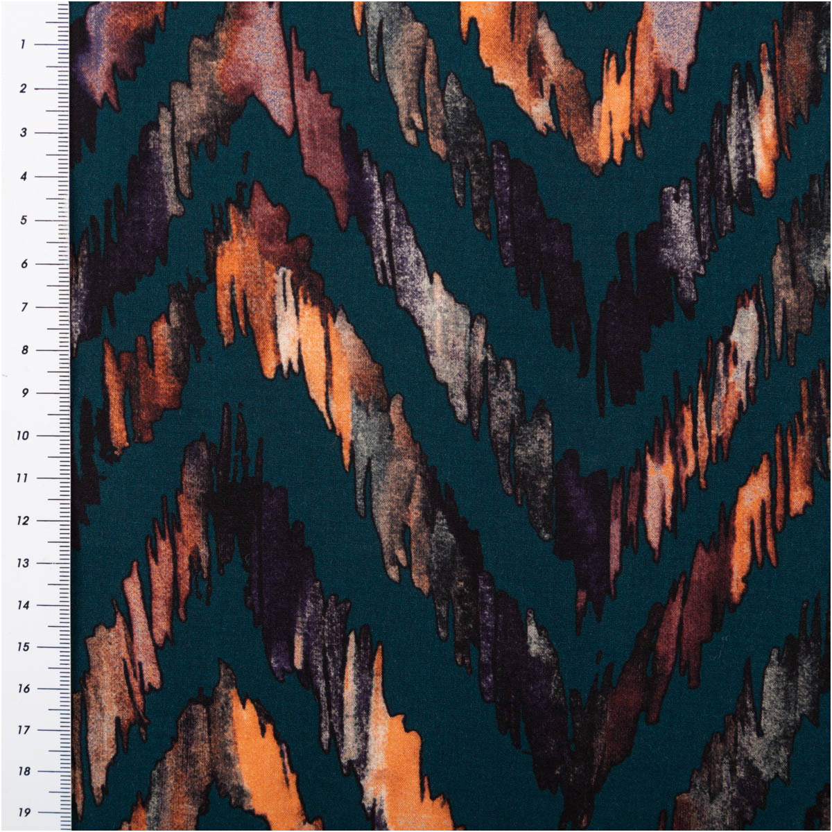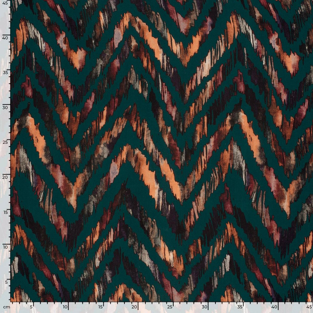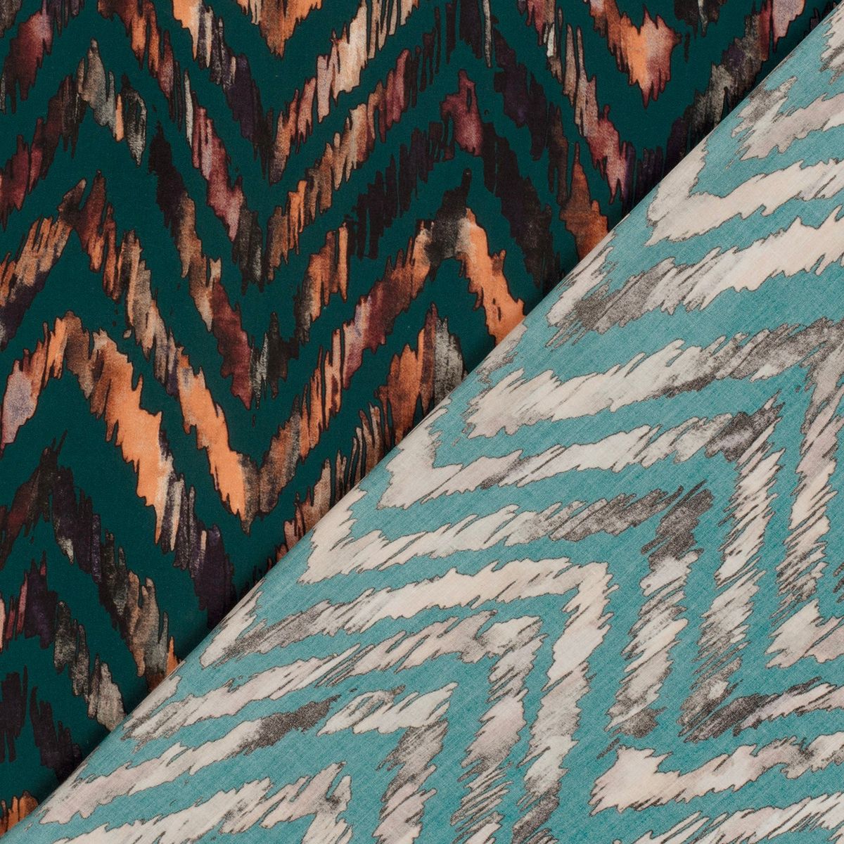 Leichte, glatte Viskose-Popeline mit abstraktem Zickzack-Dessin in warmen Naturtönen auf Dunkelgrün. Mit 145 cm Breite und ca. 110 g/m² ist er perfekt für luftige Sommer-Looks – kühl auf der Haut, weich fallend und angenehm zu tragen.