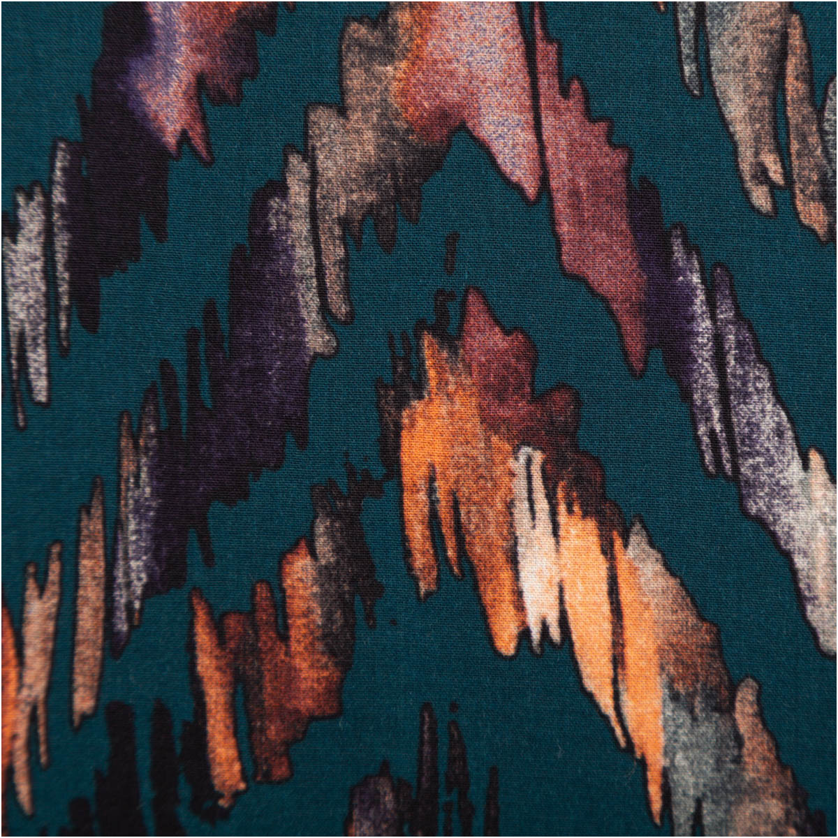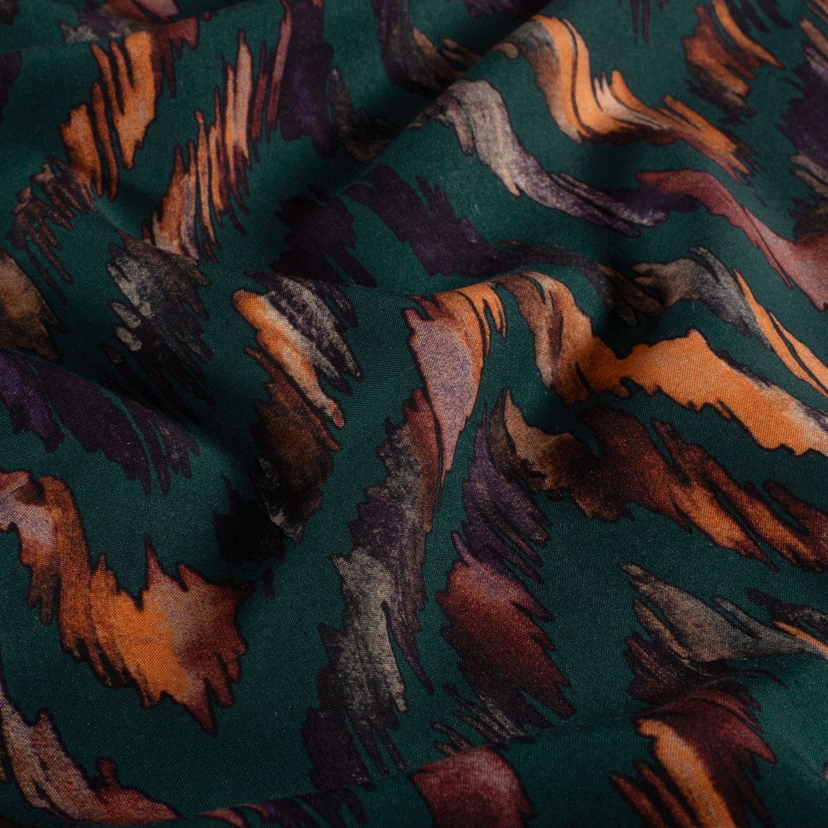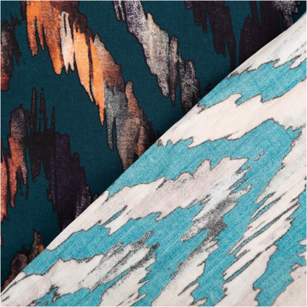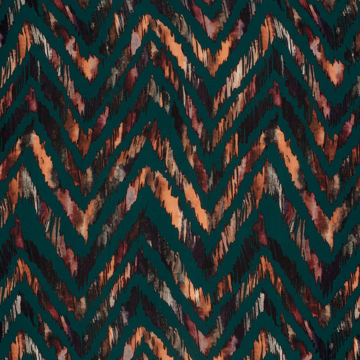 Leichte, glatte Viskose-Popeline mit abstraktem Zickzack-Dessin in warmen Naturtönen auf Dunkelgrün. Mit 145 cm Breite und ca. 110 g/m² ist er perfekt für luftige Sommer-Looks – kühl auf der Haut, weich fallend und angenehm zu tragen.