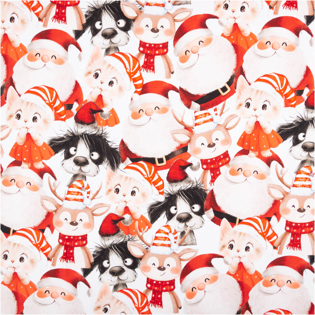 Weihnachtsdessin: Christmas Family aus Weihnachtsmännern, Hunden, Katzen und Rehen in Rot und Weiß