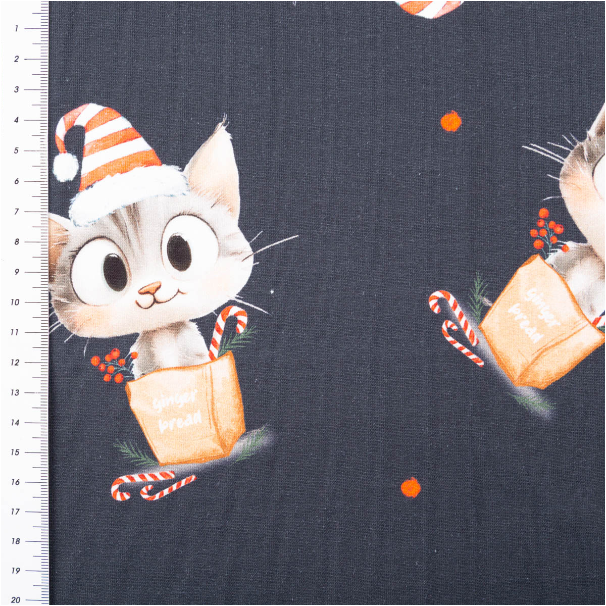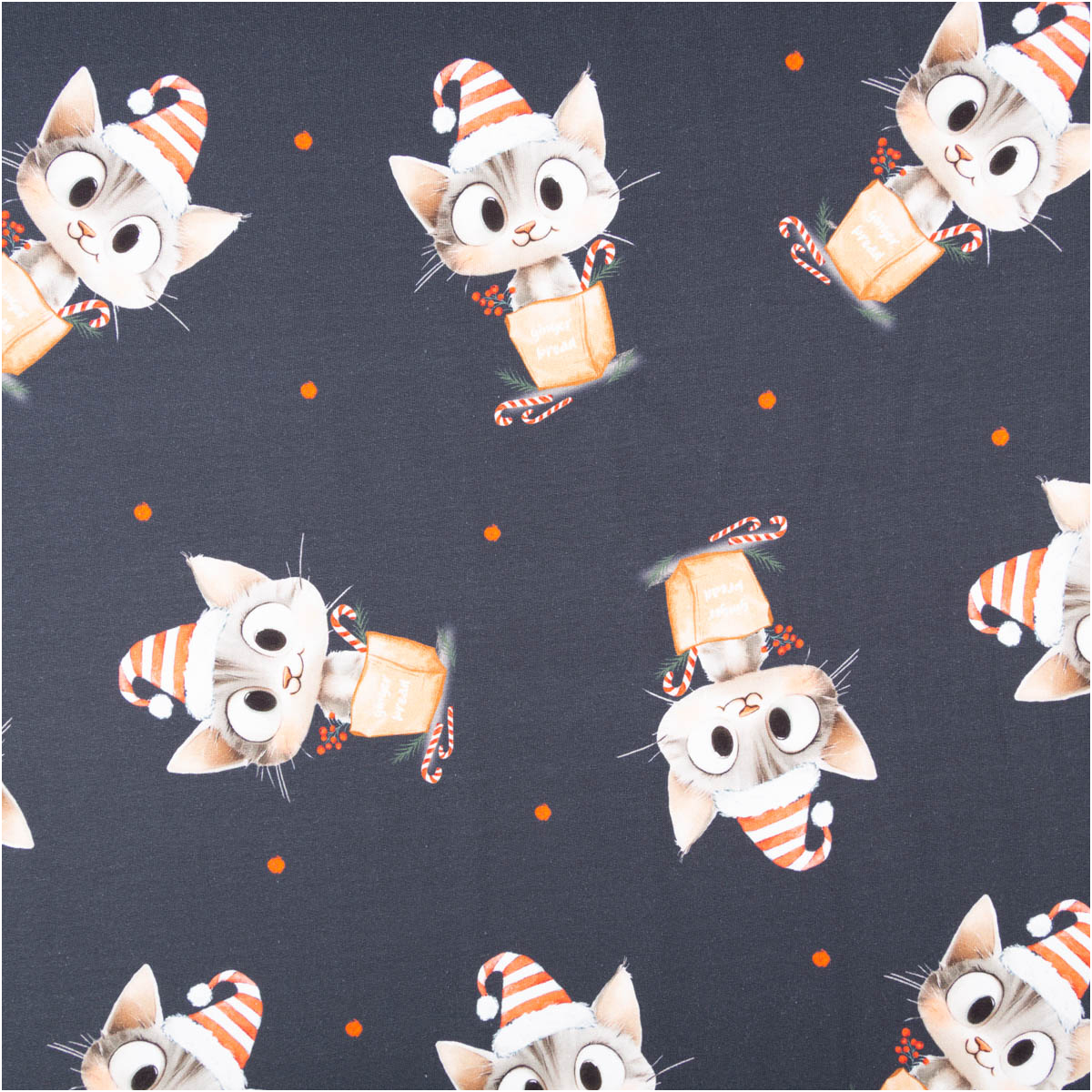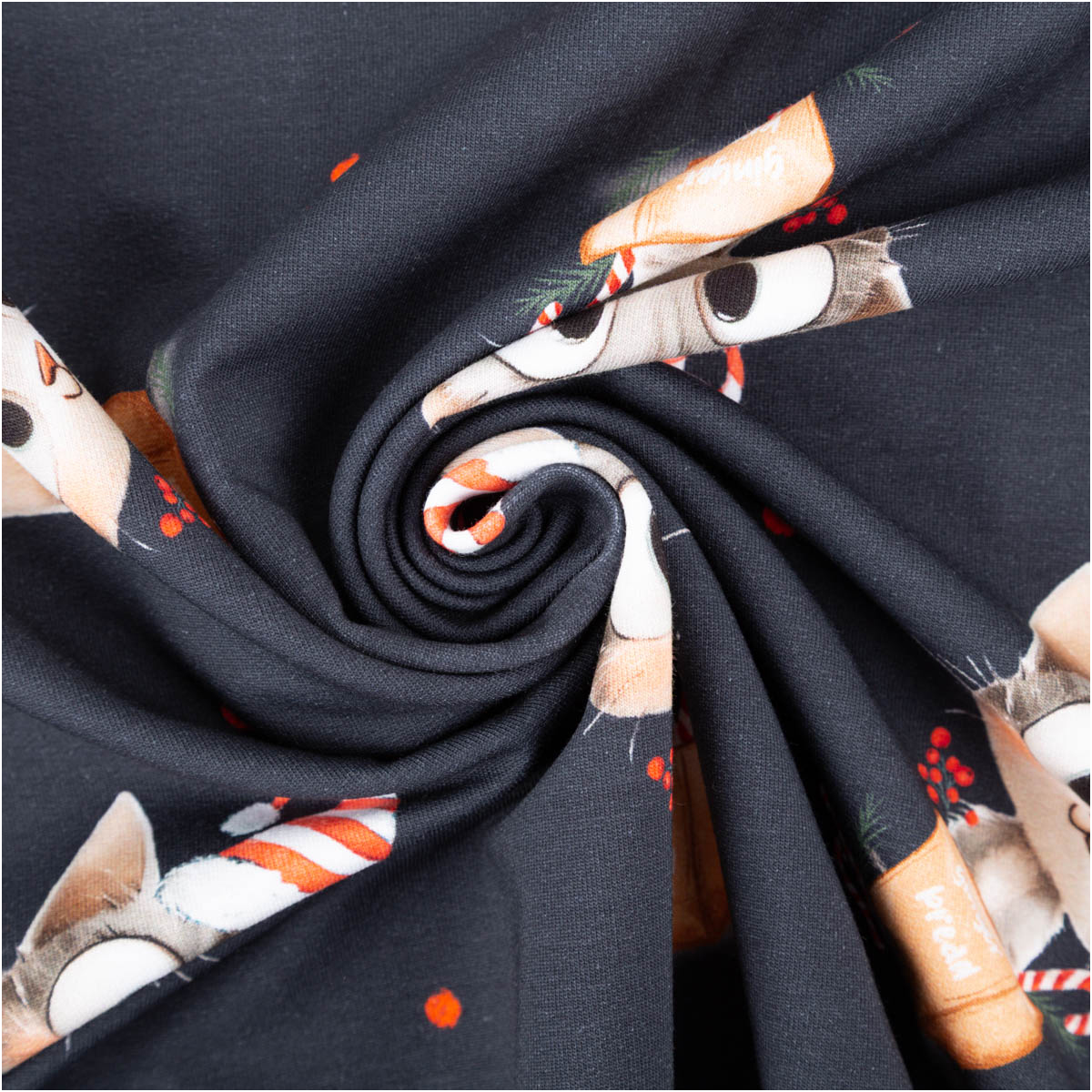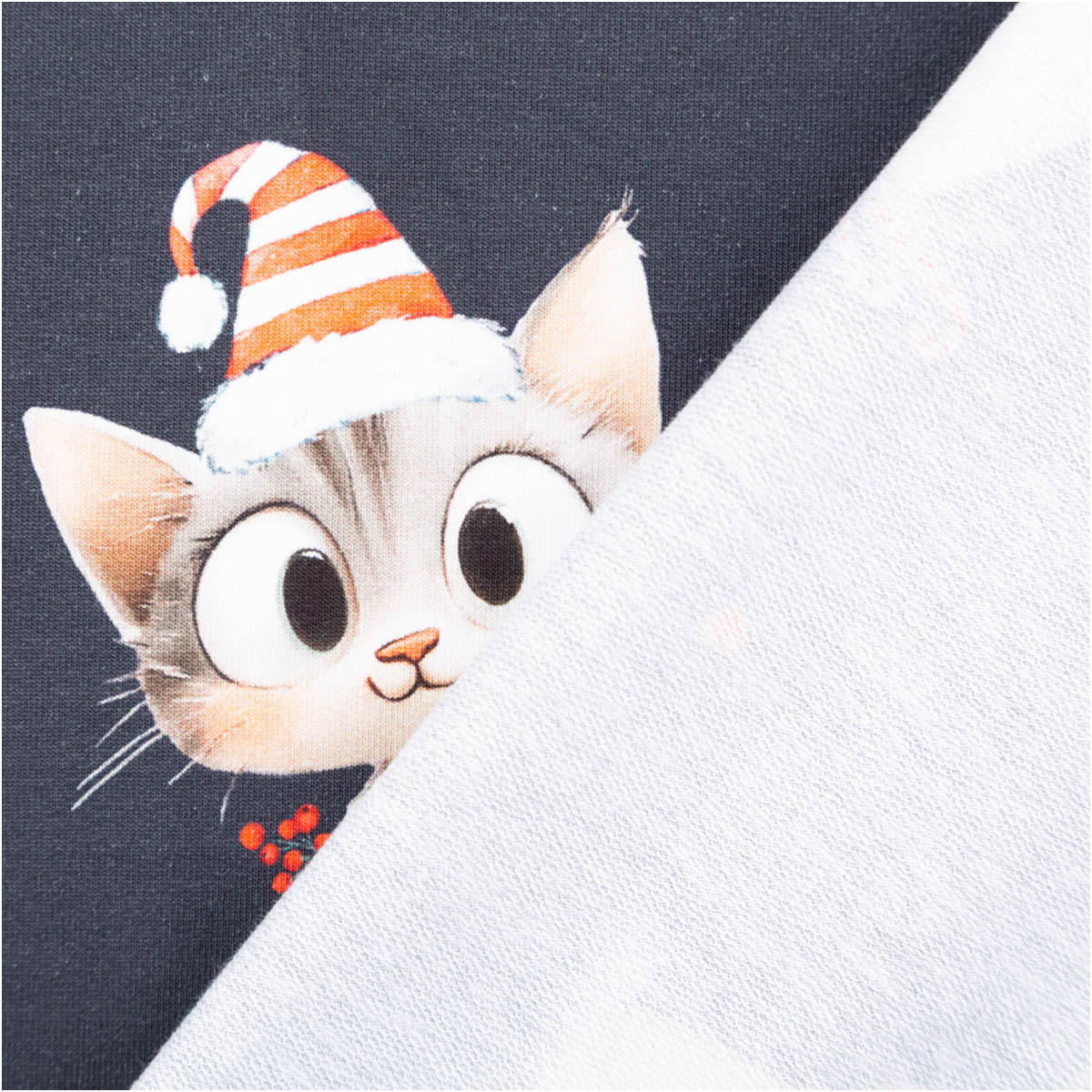 Dieser French Terry Stoff bringt Weihnachtsstimmung pur in deine Nähprojekte! Der dunkelblaue Sommersweat zeigt niedliche Kätzchen mit Weihnachtsmützen, Zuckerstangen und Geschenkschachteln – ein verspieltes Motiv, das perfekt zur festlichen Jahreszeit passt.