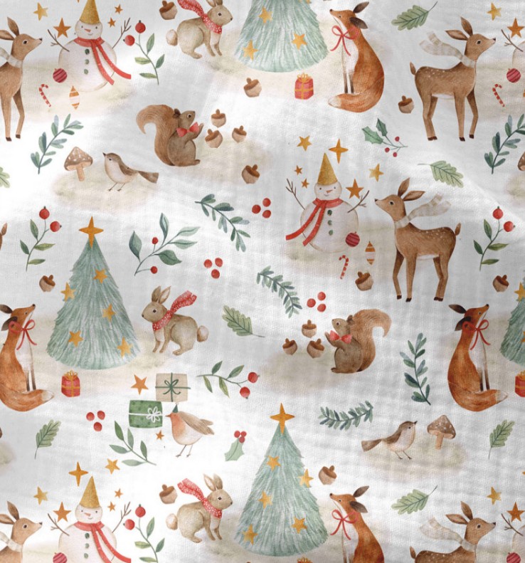 Du liebst gemütliche Weihnachtsnähprojekte? Dieser hochwertige Musselin aus 100% Baumwolle mit liebevollem Tierweihnachts-Dessin bringt sofort festliche Laune in deine Garderobe und dein Zuhause. Durch die doppellagige Double-Gauze-Webart ist der Stoff angenehm weich, atmungsaktiv und saugfähig – perfekt für alles, was direkt auf der Haut getragen wird.