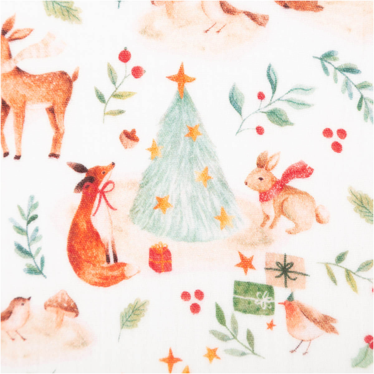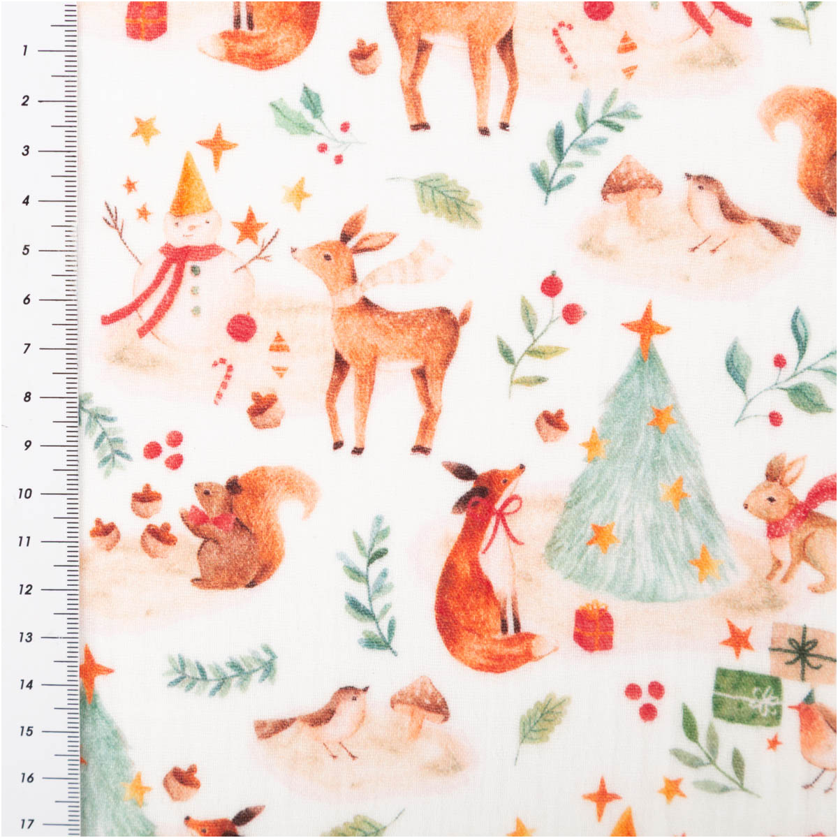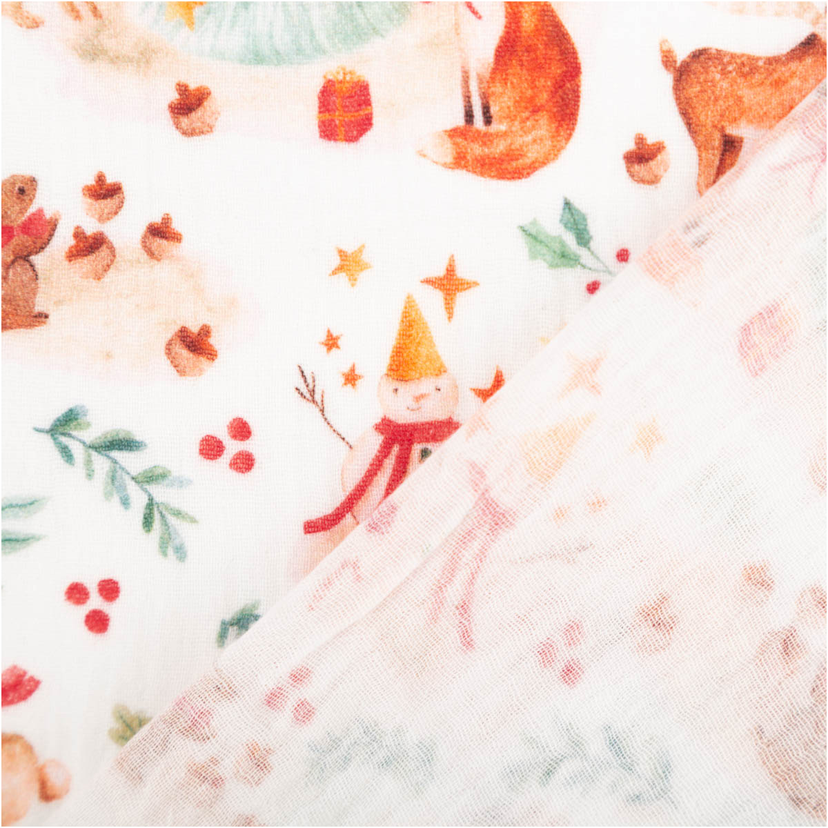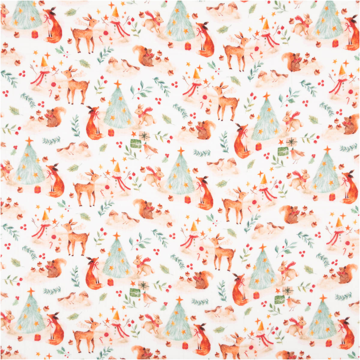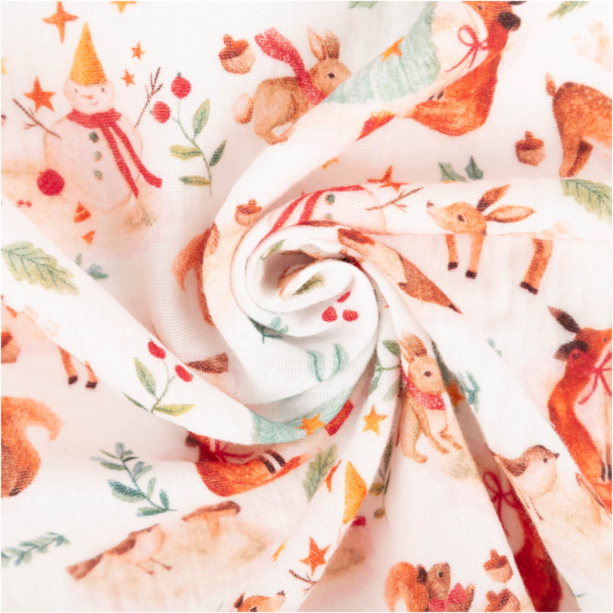 Weihnachtsstoff Musselin – Double Gauze mit Tierweihnacht, Weiß/Bunt, 130 cm