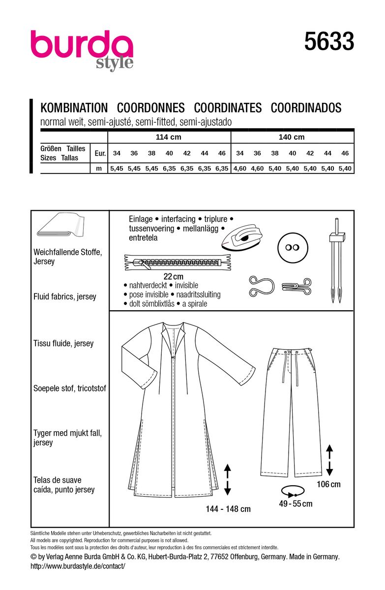 Burda Schnittmuster 5633 Damen Kombination Langmantel und Hose