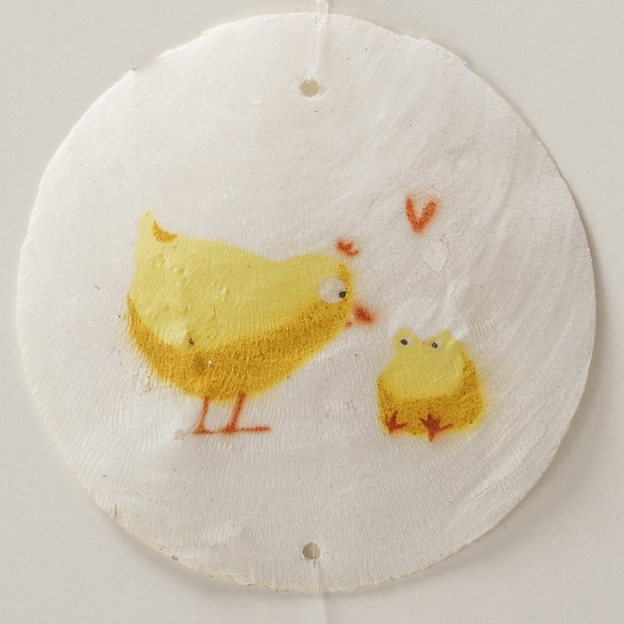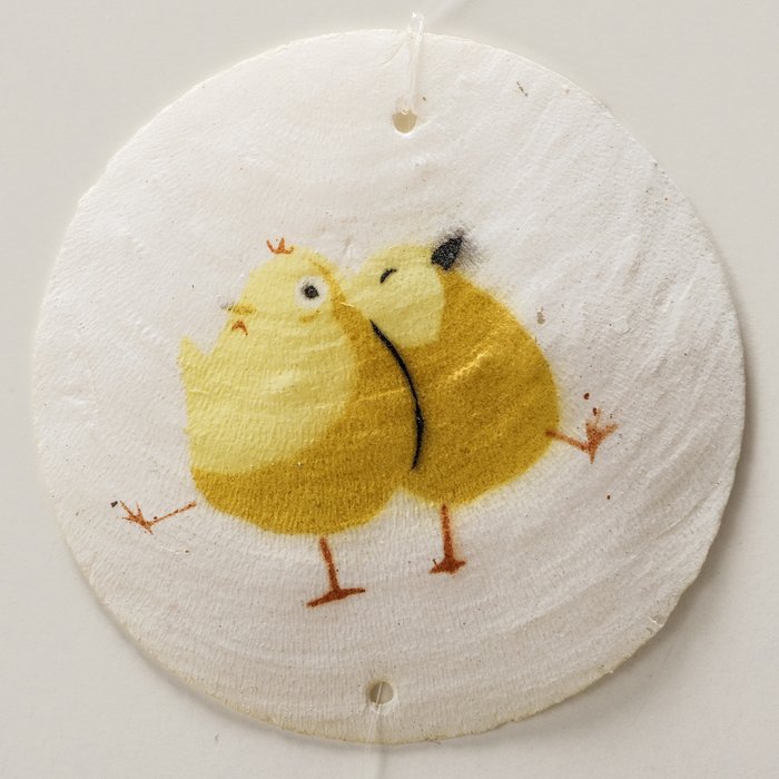 Gefertigt ist die Girlande aus Capiz und Holz. Die runden Elemente haben einen Durchmesser von ca. 7,5 cm und sind in Weiß und Gelb gestaltet. Das Material sorgt für eine feine, natürliche Optik, während die handbemalten Kükenmotive der Girlande ihren besonderen Charakter verleihen. So entsteht eine dekorative Hängedeko, die leicht wirkt und gleichzeitig viel Aufmerksamkeit auf sich zieht.
