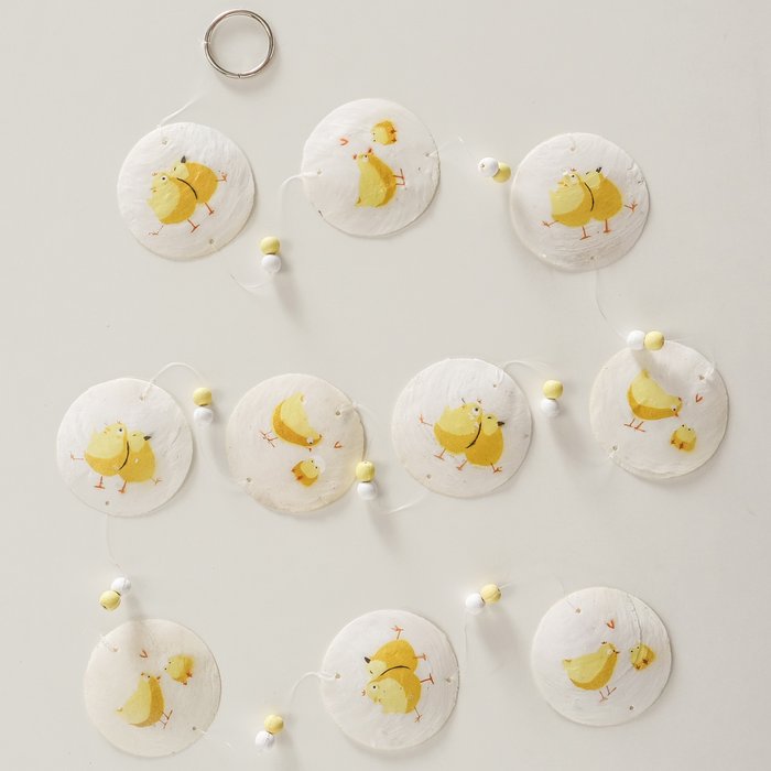 Handgearbeitete Capiz-Girlande von Boltze mit liebevollen Kükenmotiven in Weiß und Gelb für Osterdeko und Frühlingsdeko