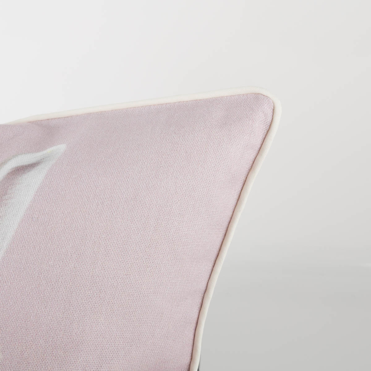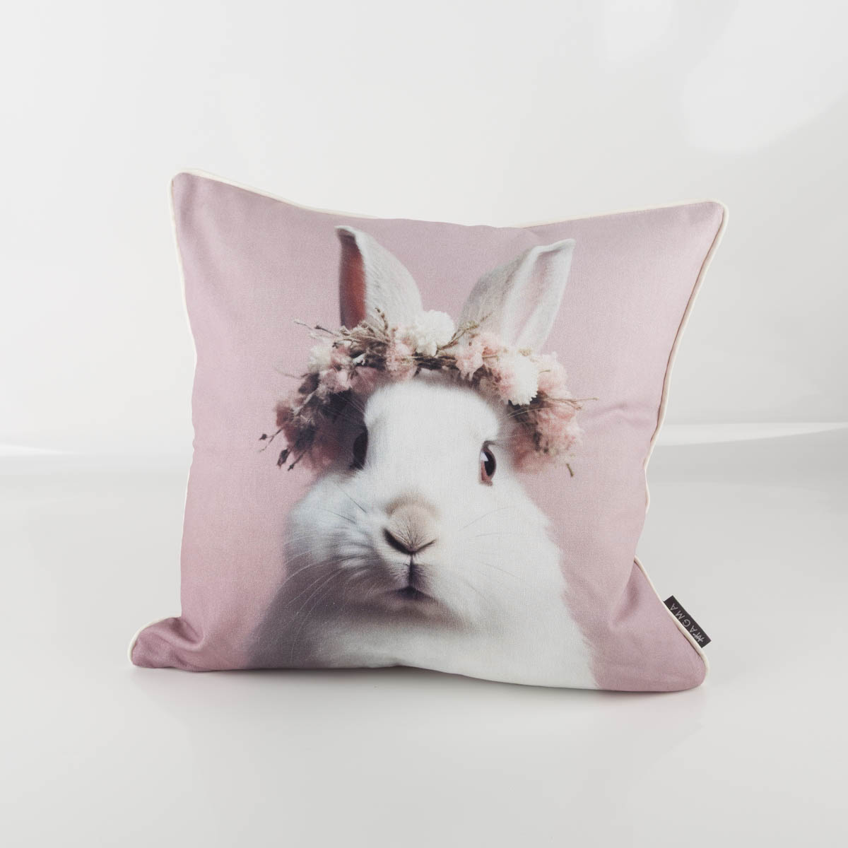 Kissenhülle 45x45cm aus Baumwolle mit Kederumrandung – Violett mit Hasen-Print & Blumenkranz