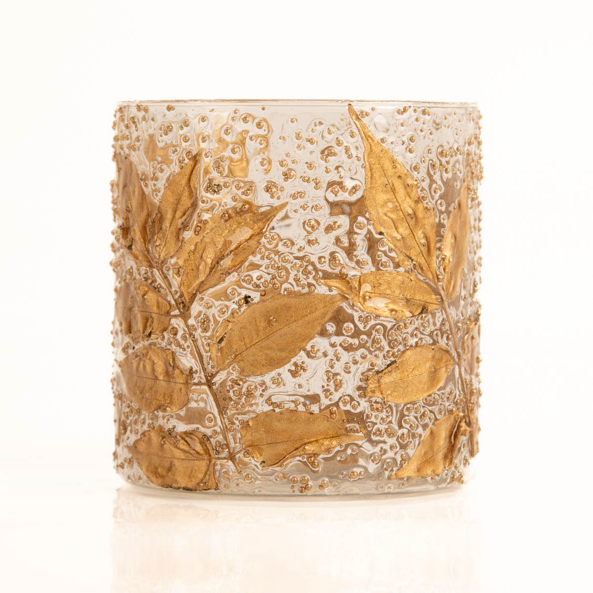 Mit dem Windlicht Leaves bringst du schimmernde Lichtakzente in dein Zuhause. Das transparente Glas ist rundum mit goldfarbenen Blättern und feinen Strukturelementen versehen, die das Kerzenlicht auf besonders schöne Weise brechen. So entsteht ein warmes, gemütliches Lichtspiel, das perfekt für Abende auf dem Sofa, festliche Tischdekorationen oder die Fensterbank geeignet ist.