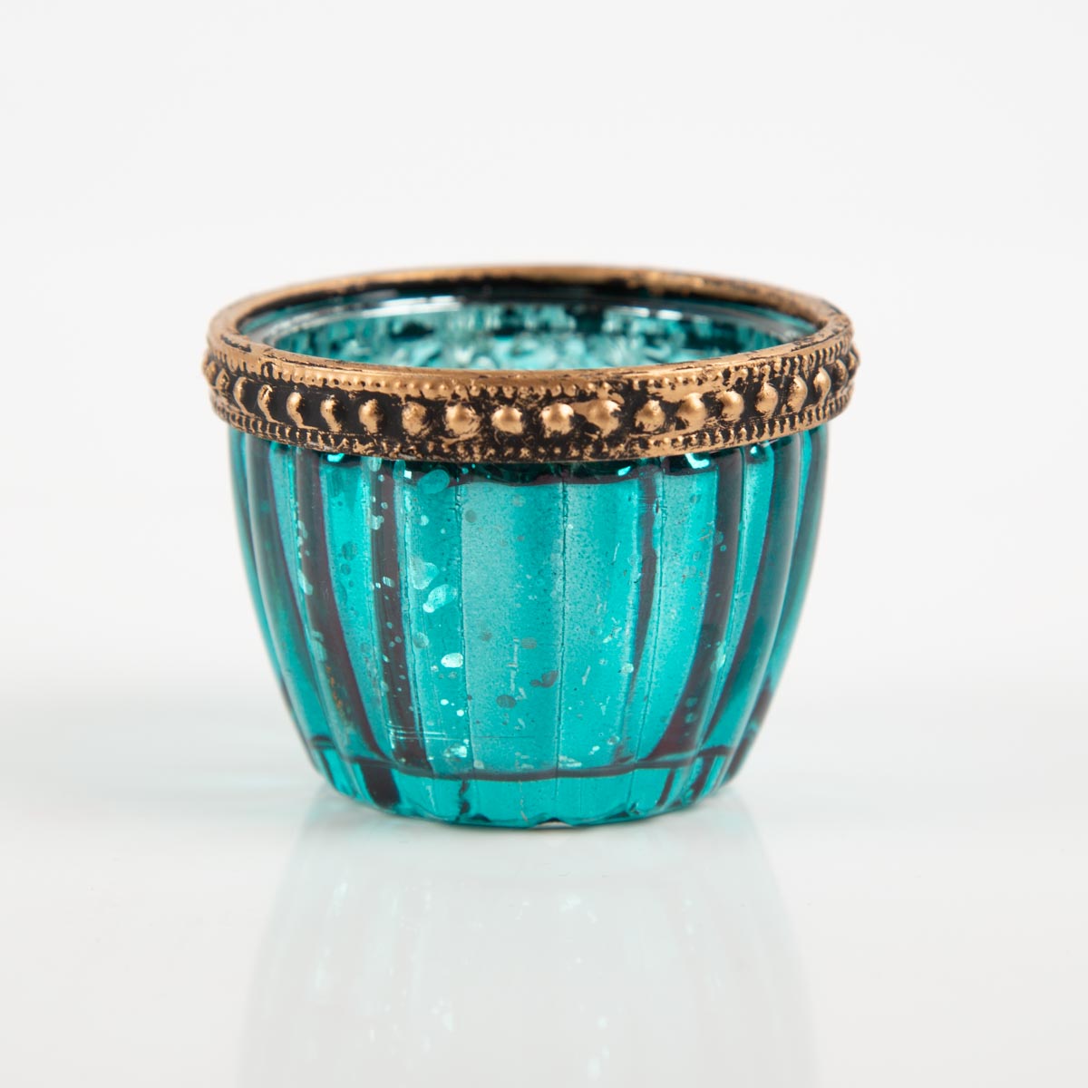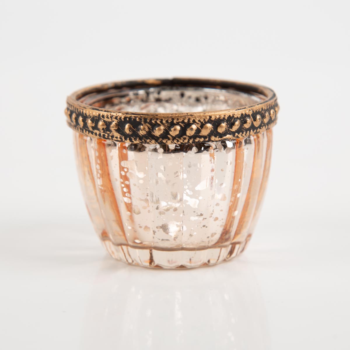 Dekorativer Teelichthalter aus gerilltem Glas mit edlem Metallrand