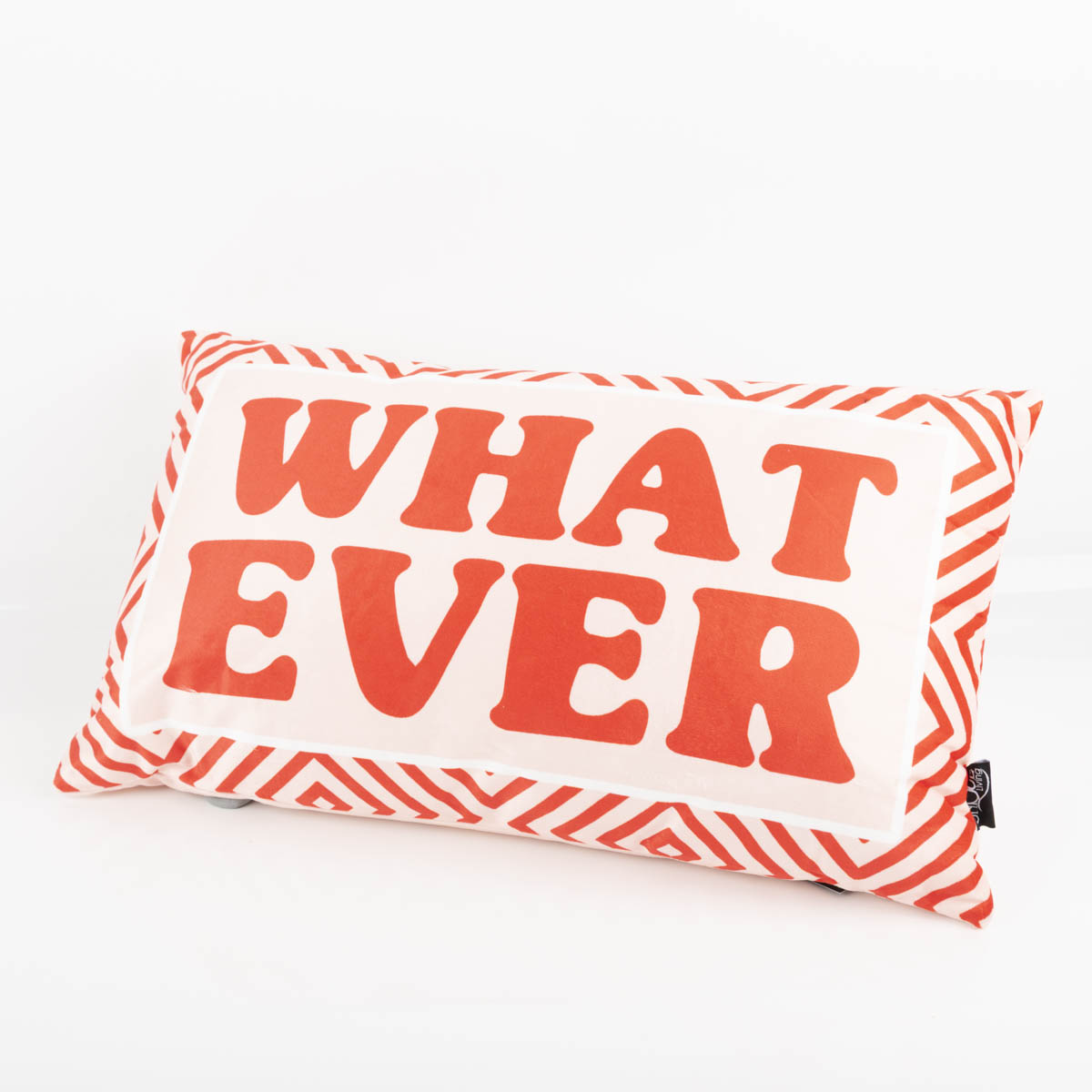 Trendiges Statement-Kissen mit rotem „WHATEVER“-Print auf rosa Grund