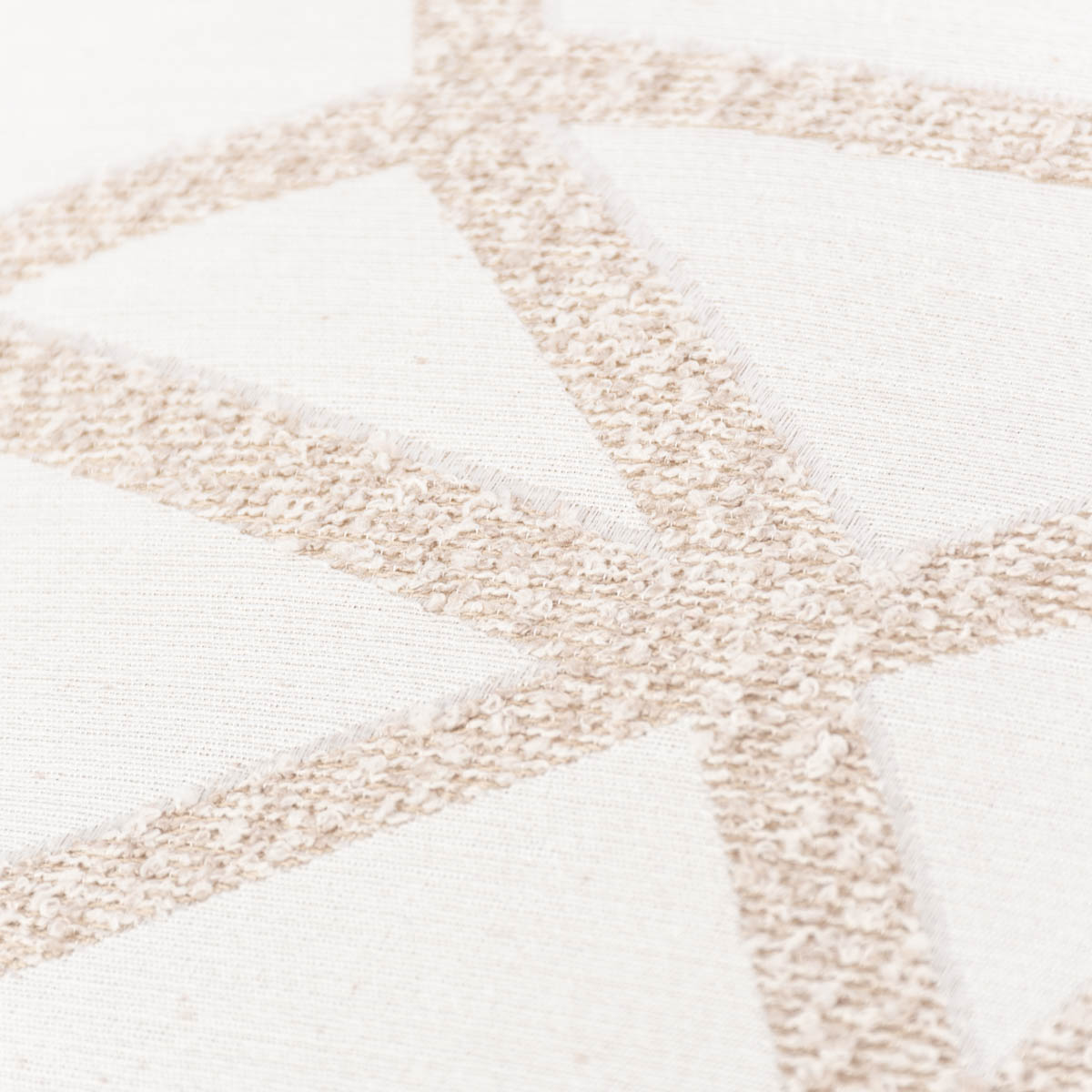 Das grafische Muster wirkt sehr modern und durch die unterschiedlichen Stoffarten, die hier aufeinandertreffen, hebt es sich besonders gut vom Grundgewebe ab. Typisch für Boucle sind die abstehenden, unterschiedlich großen Schlingen, Knötchen und Noppen, die für einen ausgesprochen mondänen Look sorgen. An der unteren Naht befindet sich der Reißverschluss, durch den eine Füllung aus Federn oder Kunstfasern eingefügt werden kann.