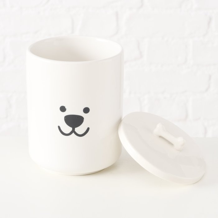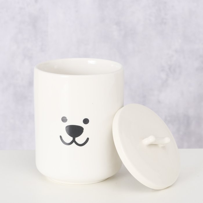 Diese weiße Vorratsdose ist dein hübscher Ordnungshelfer mit Hundemotiv. In die Dose aus Keramik (New Bone) passen bis zu 850 ml – ideal für Hundeleckerlis, Kaffee, Tee, Zucker, Salz oder Wattepads. Der runde Deckel hat einen gut greifbaren Knochen-Griff. Praktisch im Alltag: Die Dose ist lebensmittelgeeignet, mikrowellengeeignet und spülmaschinengeeignet. Dank der glatten Oberfläche lässt sie sich außerdem schnell reinigen.