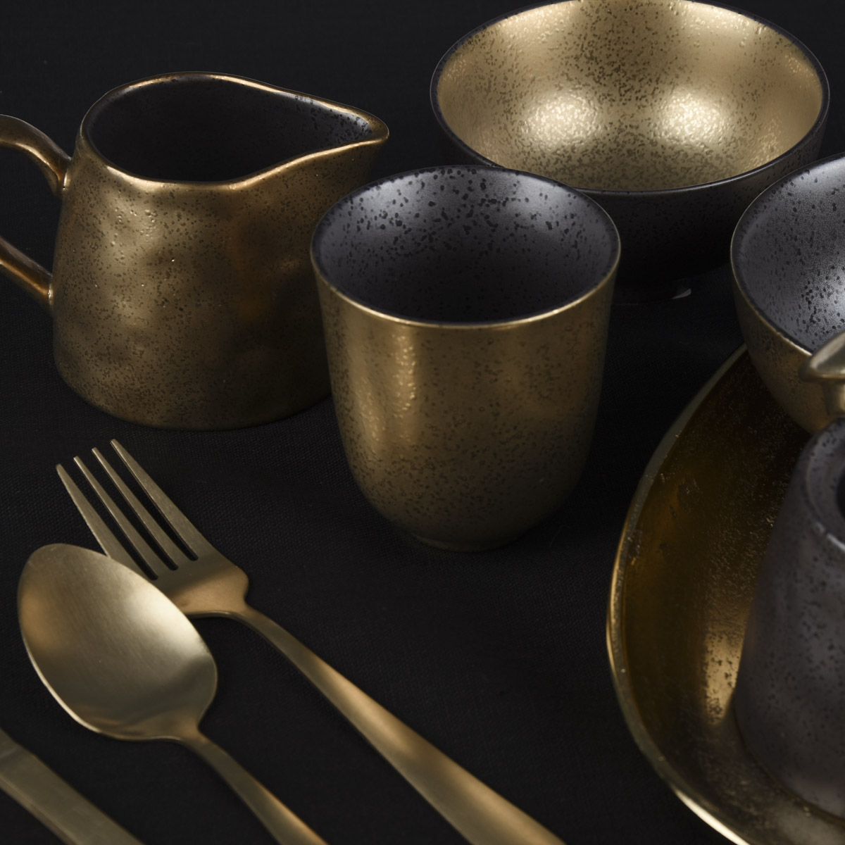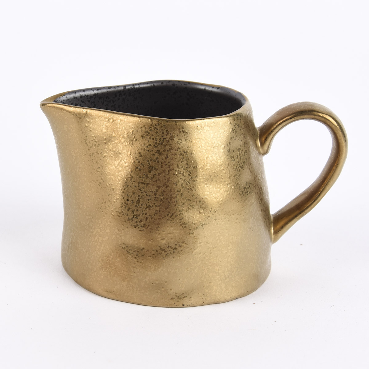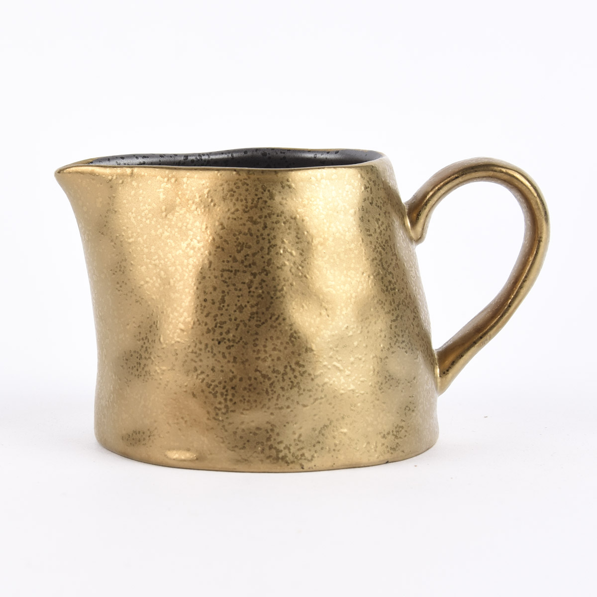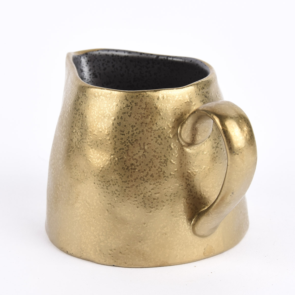 Die Lasierung ist dabei nicht regelmäßig, stattdessen sieht sie etwas getröpfelt aus. Genauso unregelmäßig ist auch die Oberfläche des Milchkännchens. Dabei ist es außen goldfarbig und innen schwarz bzw. dunkelgrau.