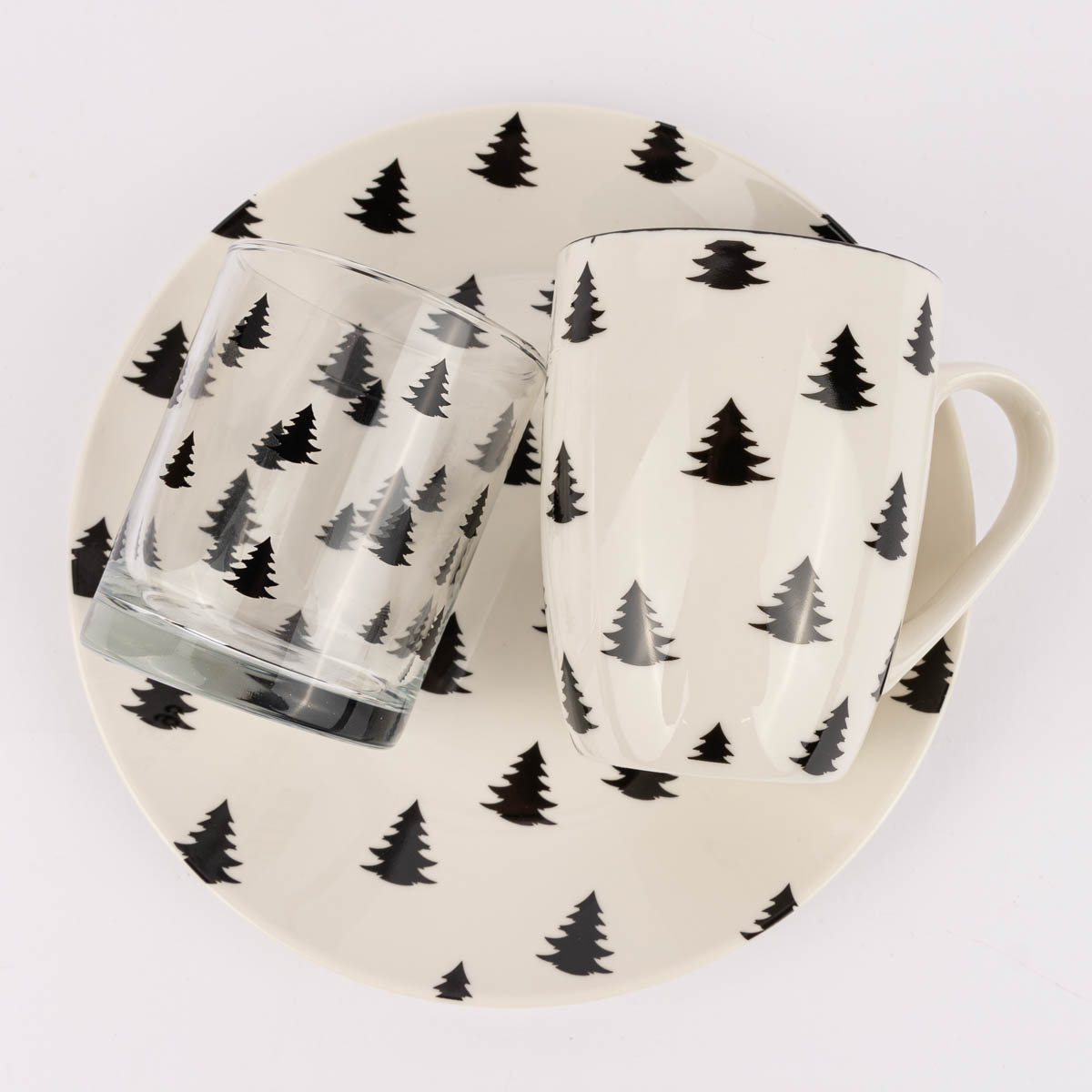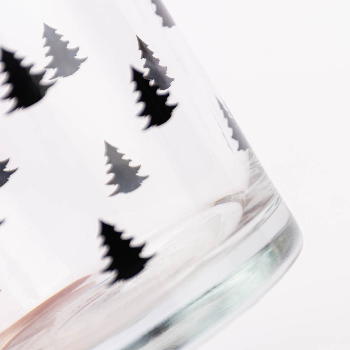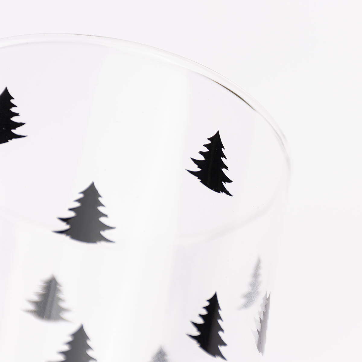 Die Weihnachtsbäume heben sich in Schwarz von der transparenten Glasoberfläche ab. So vereint der Druck einen weihnachtlichen und zugleich modernen Look in einem.