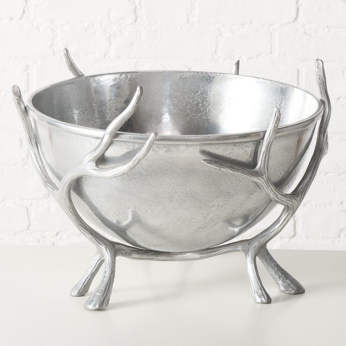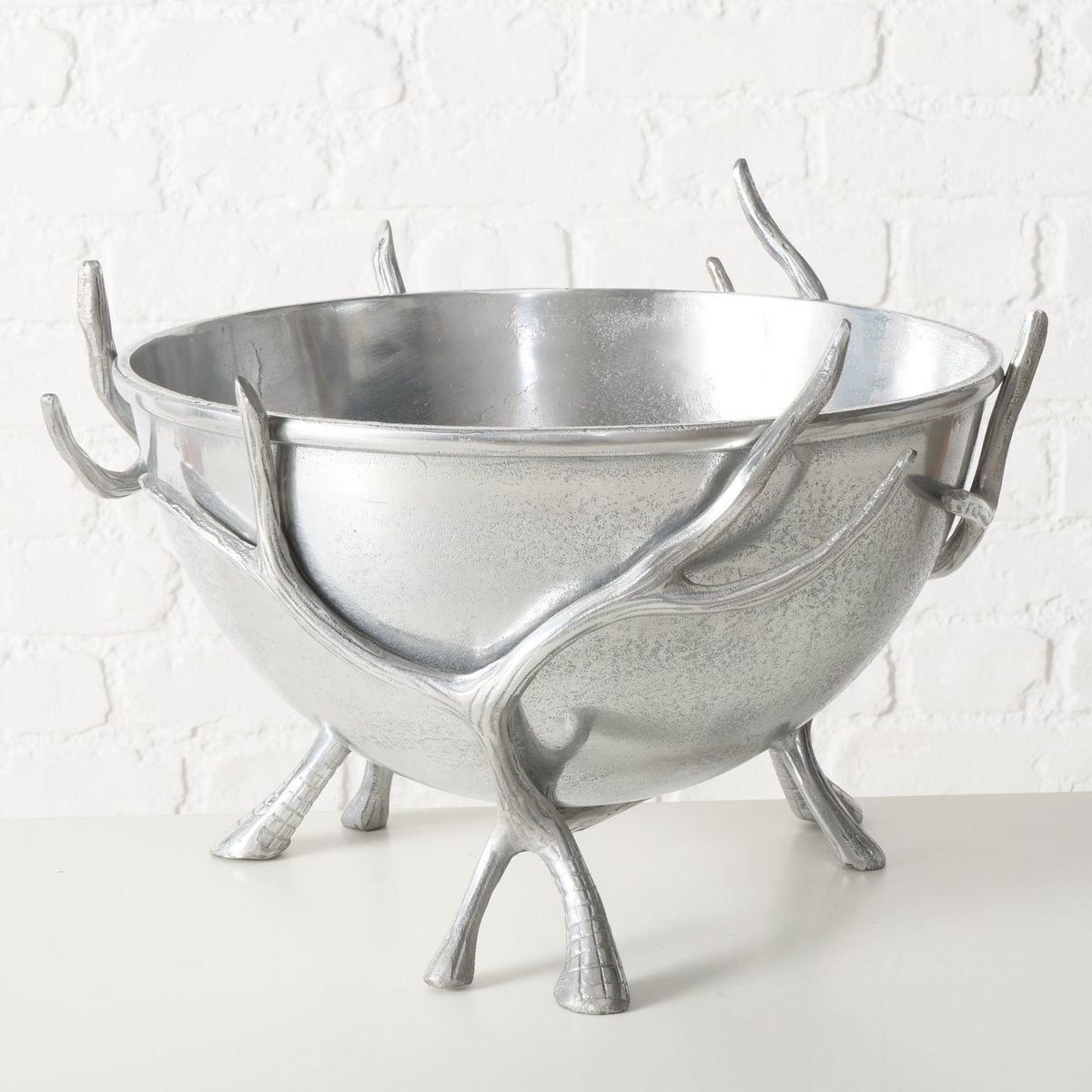 Mit diesem außergewöhnlichen Flaschenkühler setzt du Getränke eindrucksvoll in Szene. Die großzügige silberfarbene Kühlschale wird von kunstvoll gestalteten Hirschgeweihen getragen, die zugleich als dekorative Standfüße dienen. So verbindest du praktischen Nutzen mit markanter Optik und holst dir ein Wohnaccessoire nach Hause, das sofort Aufmerksamkeit erzeugt.
