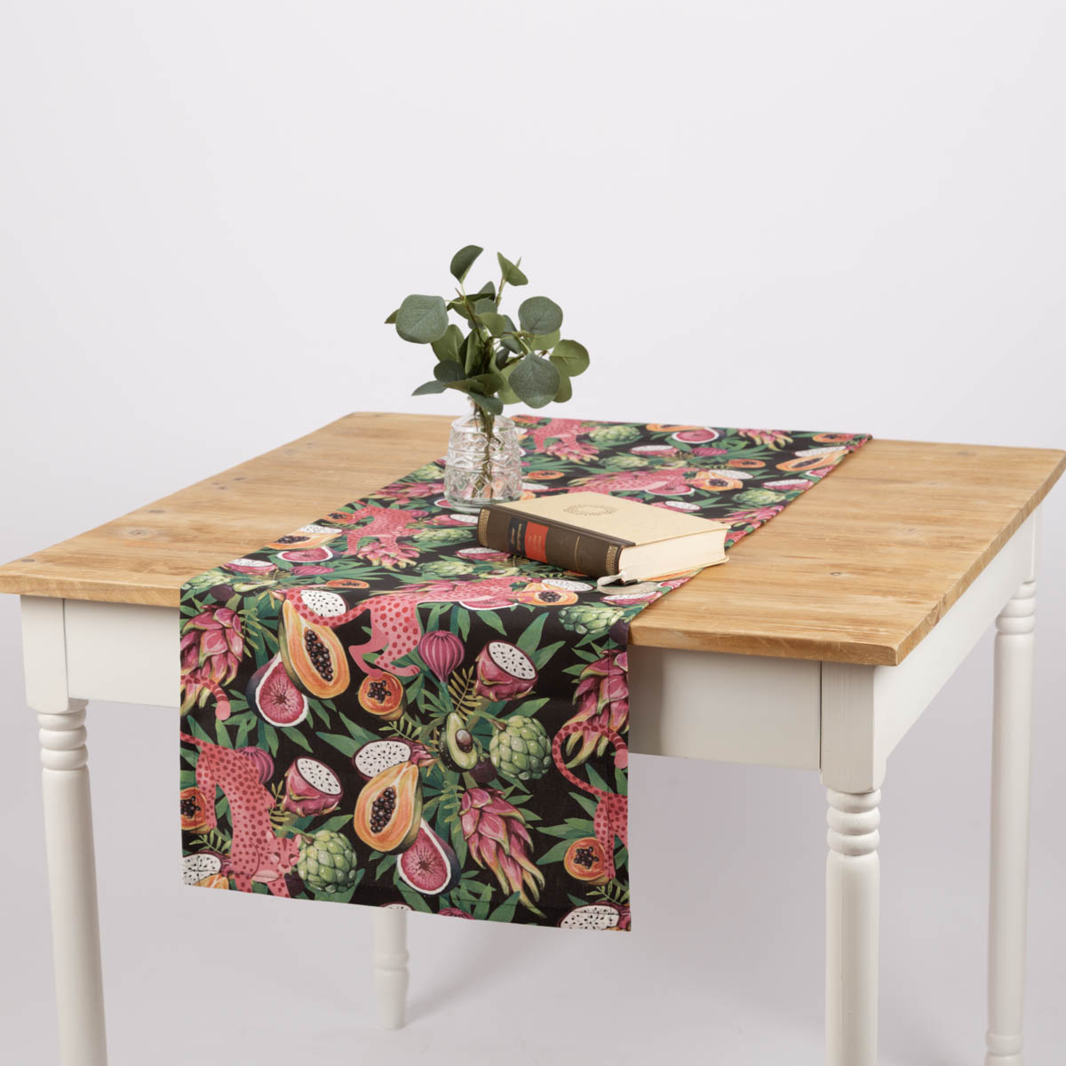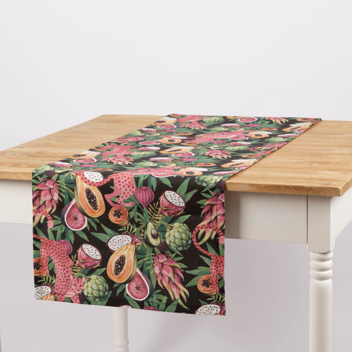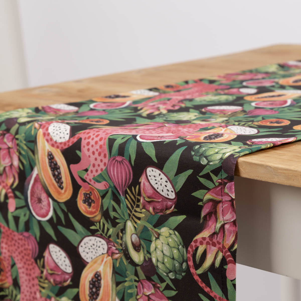 Tischläufer aus Baumwolle mit Jaguar und Früchten (40x160cm) – handgefertigt in Deutschland, Teil der SCHÖNER LEBEN. Kollektion