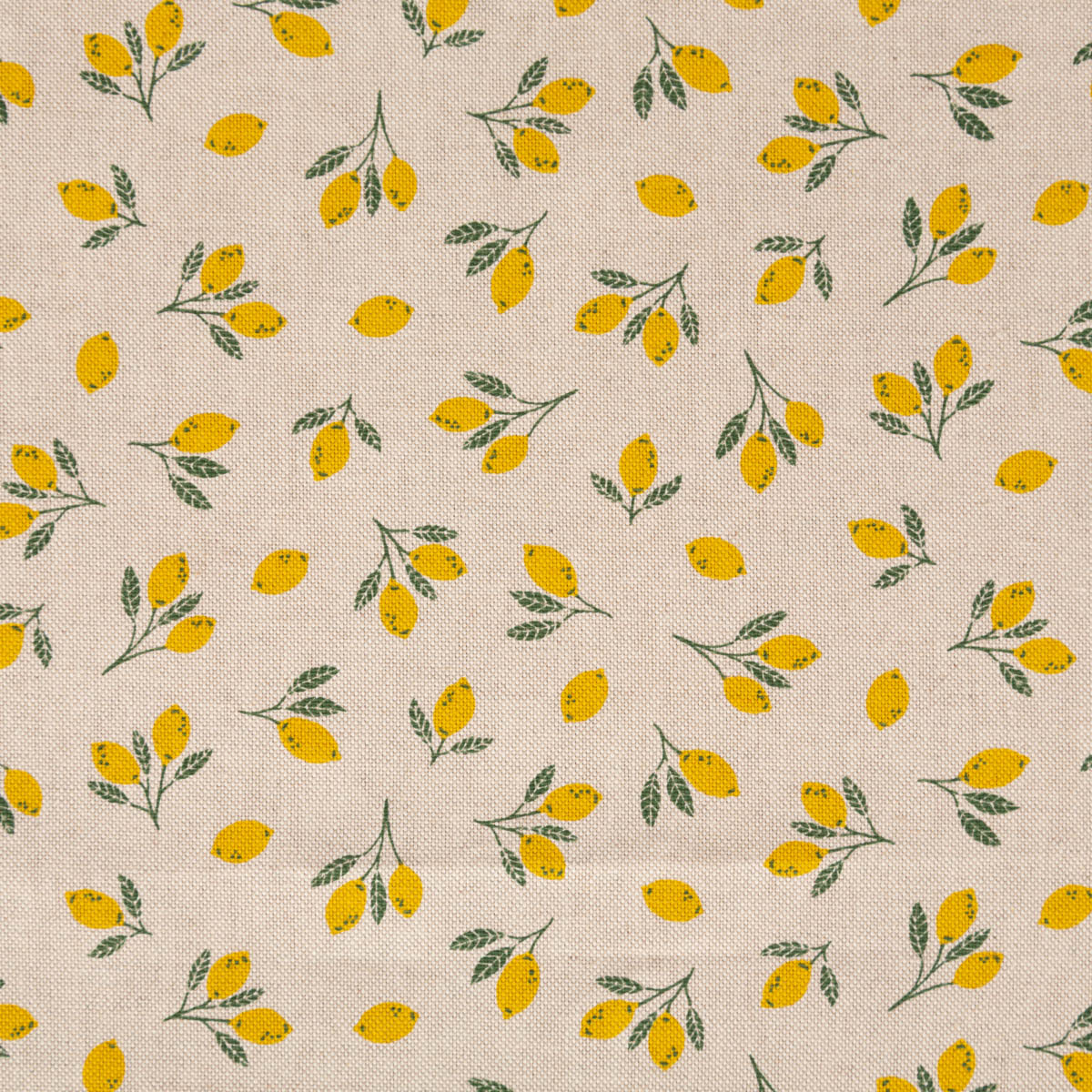 Die kleinen gelben Früchte mit grünen Blättern wirken lebendig und frisch auf dem hellen Grundstoff. Perfekt, um deinem Ess- oder Gartentisch ein sommerliches Flair zu verleihen.