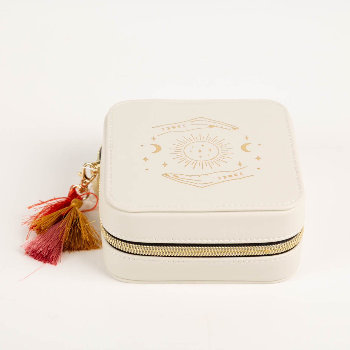 Das Schmuckkästchen Celestial vereint funktionale Ordnung mit einer ruhigen, spirituell inspirierten Ästhetik. Die feine Goldfolienprägung mit Sonnen-, Mond- und Sternmotiven verleiht dem weißen Etui eine besondere Leichtigkeit und macht es zu einem stilvollen Begleiter für Zuhause und unterwegs.