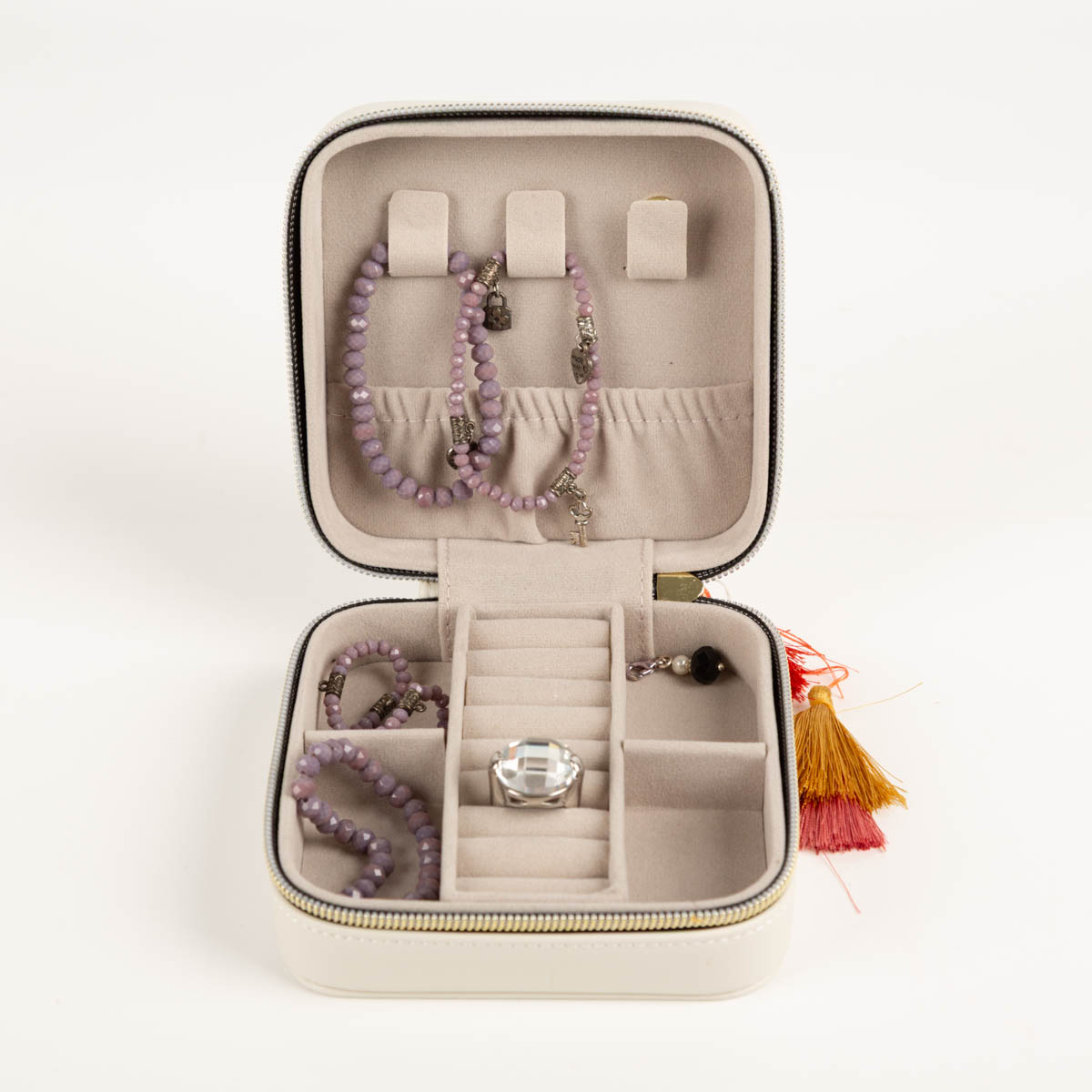 Dank seines kompakten Formats passt das Schmuckkästchen problemlos in Handtasche oder Koffer und sorgt dafür, dass deine Lieblingsstücke jederzeit sicher und übersichtlich verstaut sind.