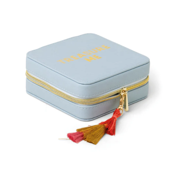Das Schmuckkästchen besteht aus veganem Leder und ist mit einer goldfarbenen Folienprägung veredelt. Der stabile Reißverschluss mit goldfarbenem Zipper sorgt für sicheren Halt, während die abnehmbare, farbige Quaste einen verspielten Akzent setzt.