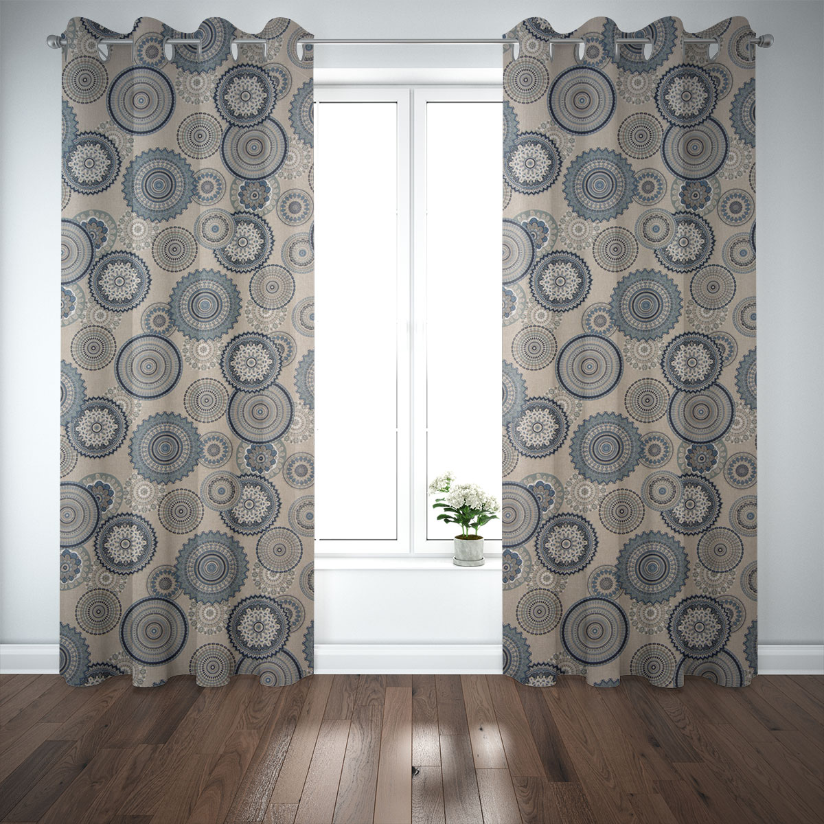 Die runden, verschieden großen Ornamente in Blau und Beige wirken auf dem naturfarbigen Grundstoff besonders harmonisch und durch den detailreichen Druck sehr edel. Die leuchtenden Farben und die feinen Details machen unseren Vorhang zu einem besonderen Blickfang und lassen jedes Fenster strahlen.