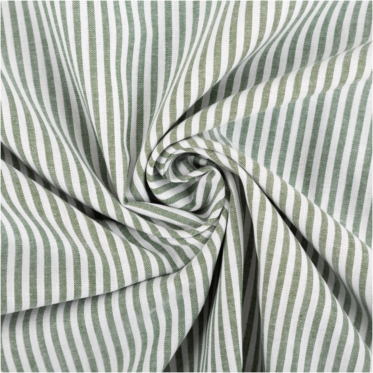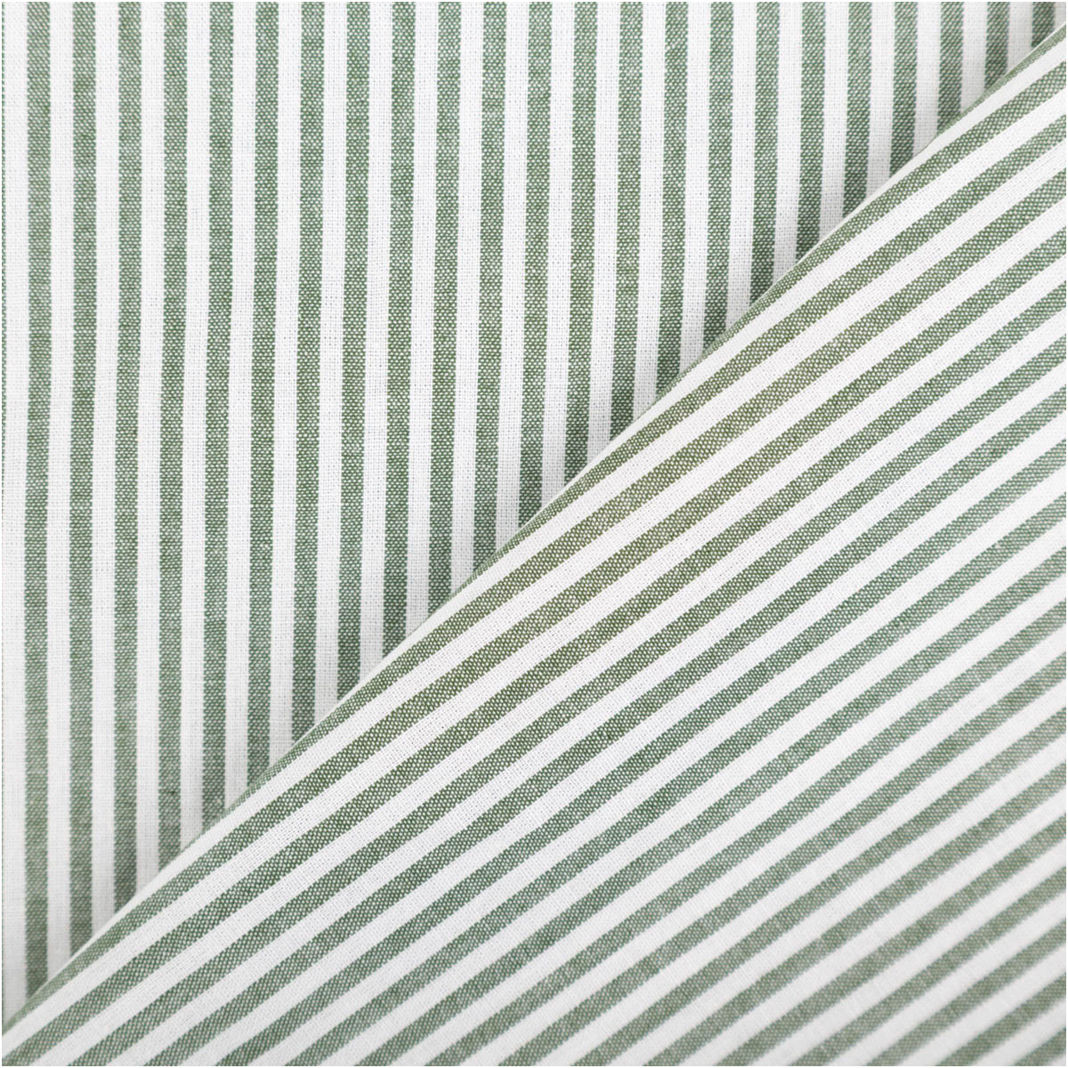Dieser Baumwollstoff als Popeline Meterware begeistert mit feinen 3-mm-Streifen in dunkelgrün und weiß, einer angenehm glatten Haptik und einer hochwertigen garngefärbten Qualität. Durch die Yarn-Dyed-Verarbeitung werden die Garne bereits vor dem Weben gefärbt. So entsteht ein besonders gleichmäßiges, klares Streifenbild, das auf Vorder- und Rückseite schön wirkt und dem Stoff eine edle, textile Ausstrahlung verleiht.