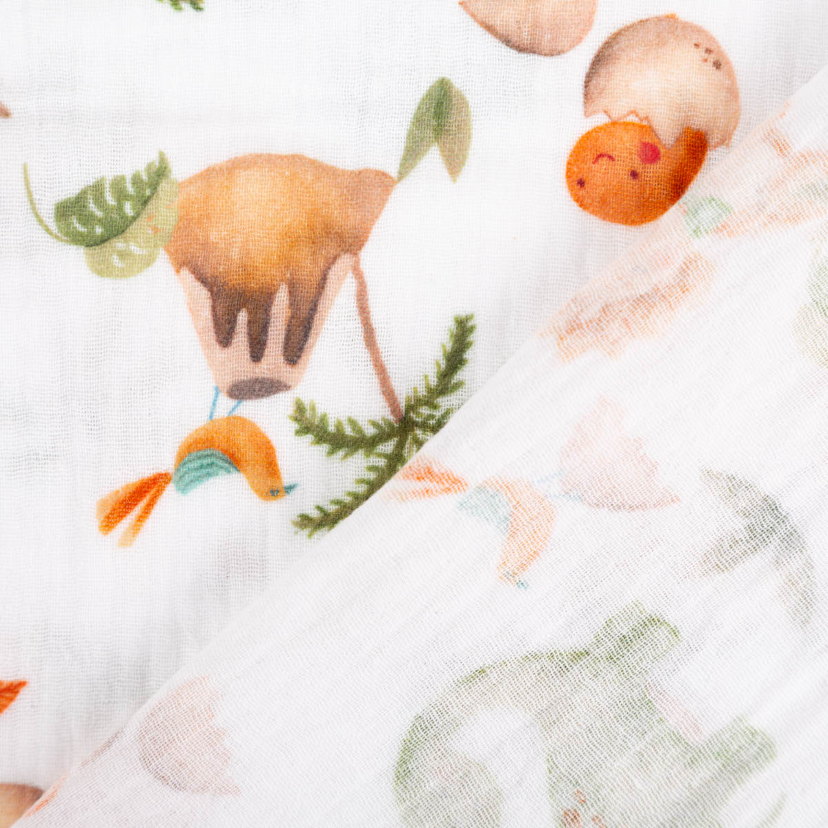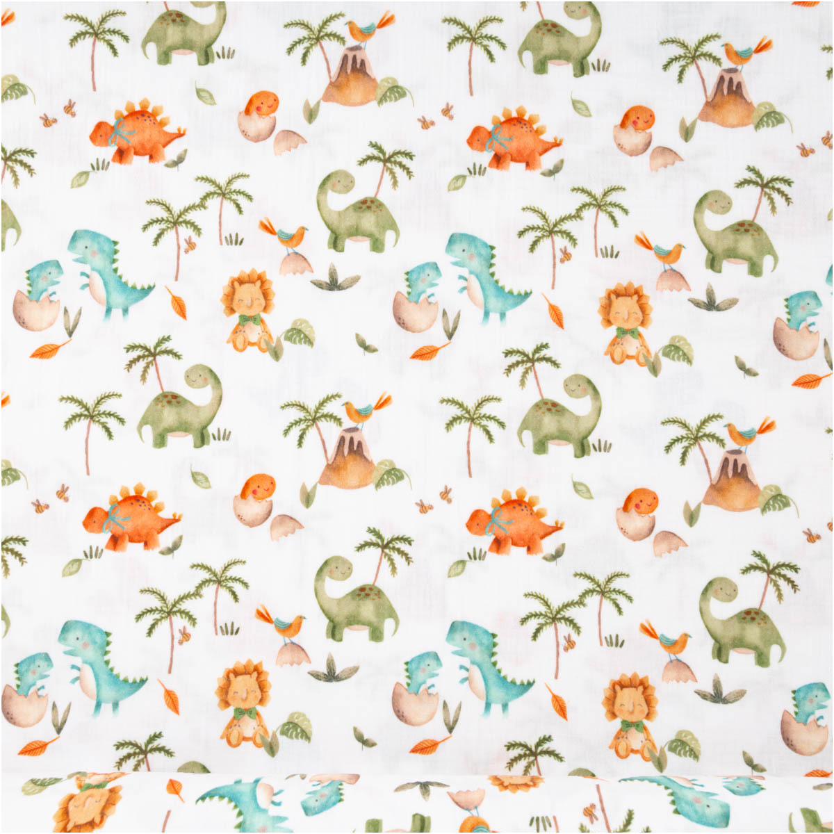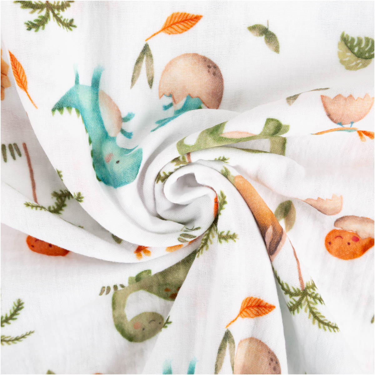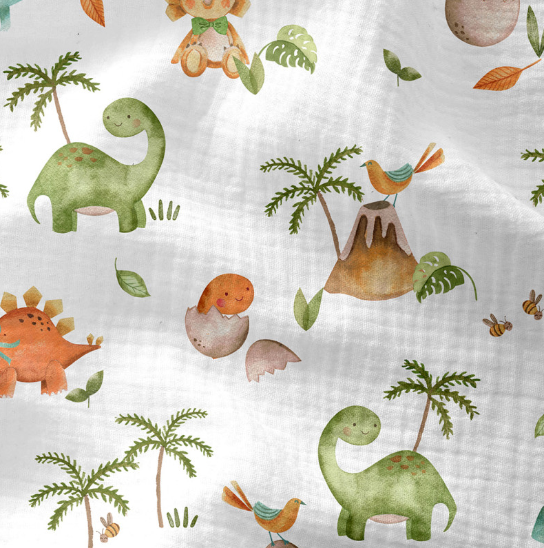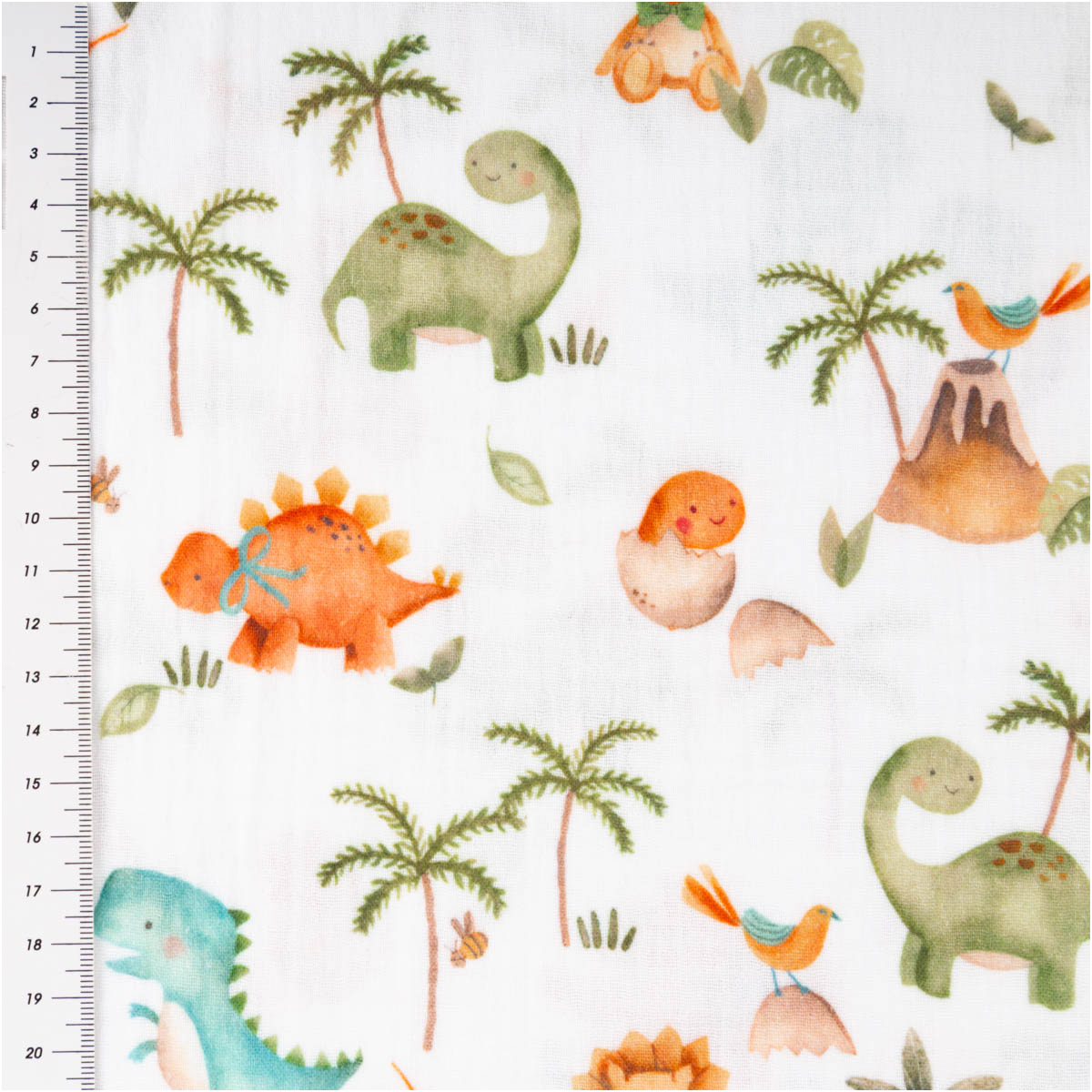 Musselin Stoff aus Baumwolle mit Dinosaurier-Digitaldruck in Weiß und Grün