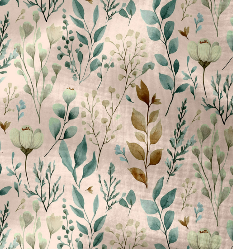 Dieser hochwertige Musselin Stoff aus 100 % Baumwolle überzeugt mit dem exklusiven französischen Dessin „Mariva“. Zarte Blätter, Gräser und florale Elemente in harmonischen Grüntönen verteilen sich locker auf hellem Grund. Das Design wirkt ruhig, natürlich und elegant zugleich – ideal für Baby-, Kinder- und Wohlfühlprojekte mit besonderem Anspruch.