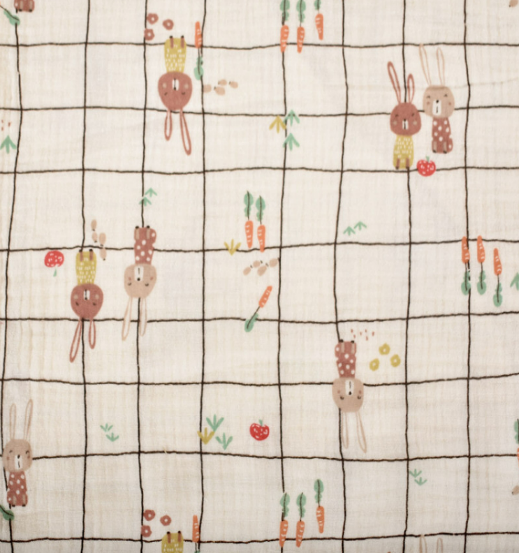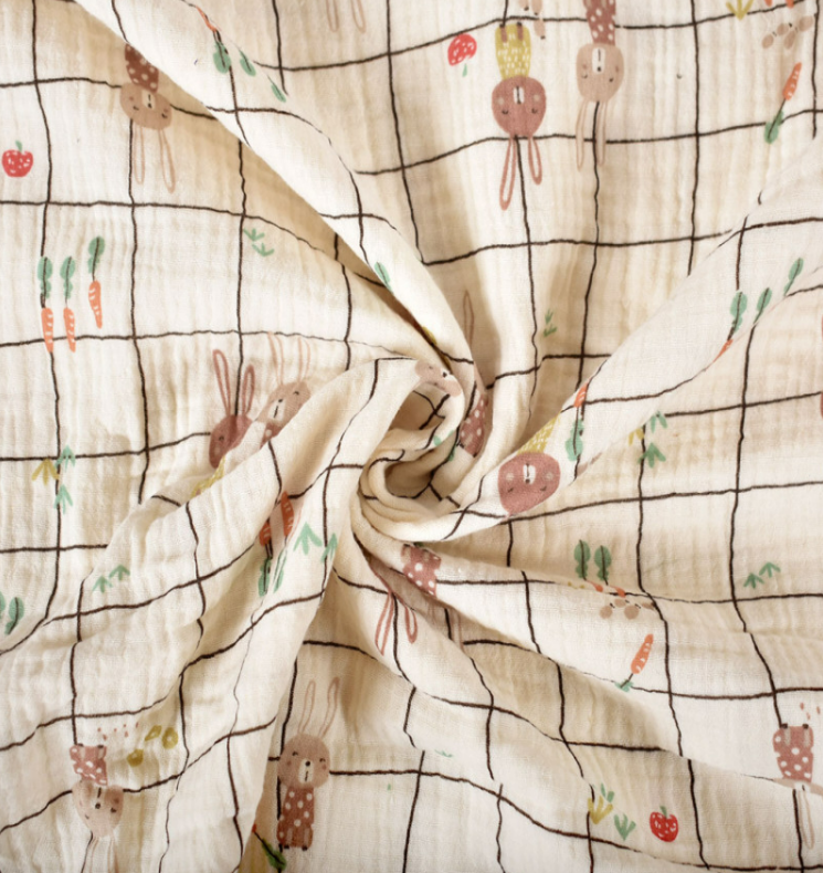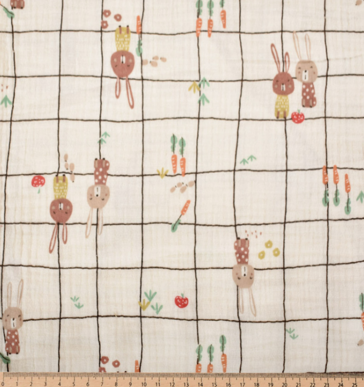 Dieser hochwertige Musselin Stoff aus 100 % Baumwolle überzeugt mit einem liebevollen Hasenmotiv im Karodesign auf ecrufarbenem Grund. Das exklusive französische Dessin wirkt ruhig, verspielt und harmonisch – perfekt für Baby-, Kinder- und Wohlfühlprojekte.