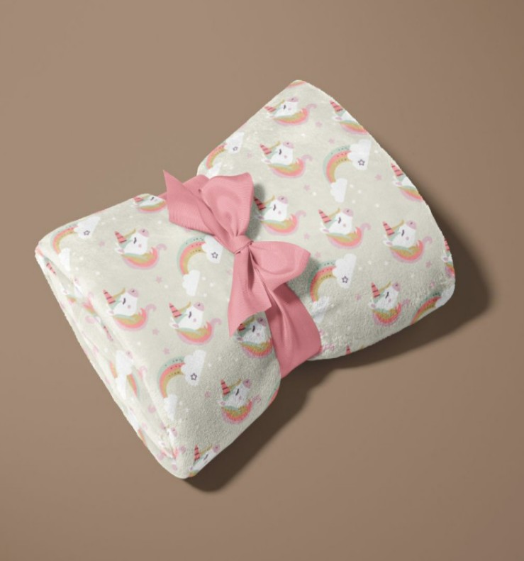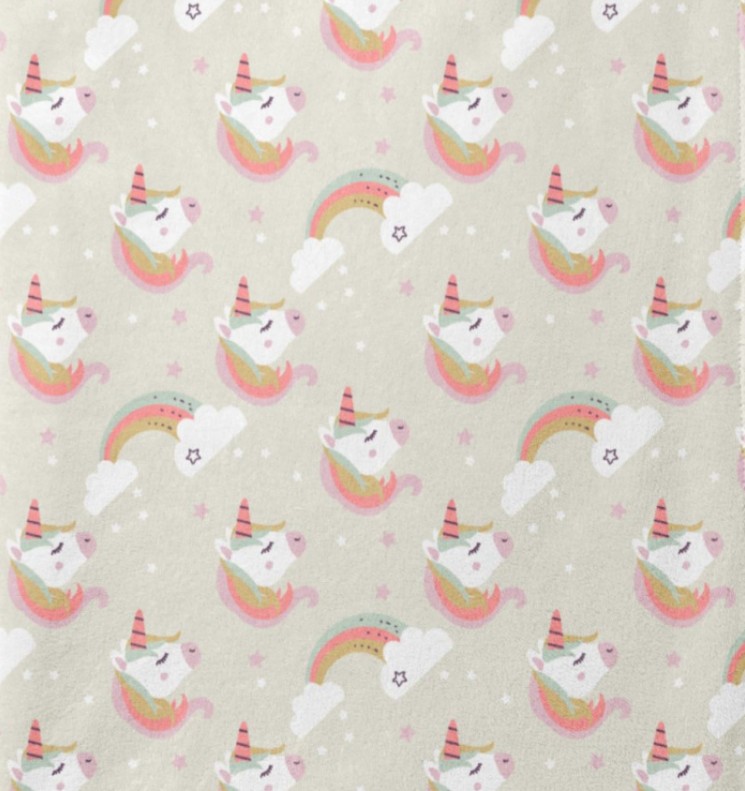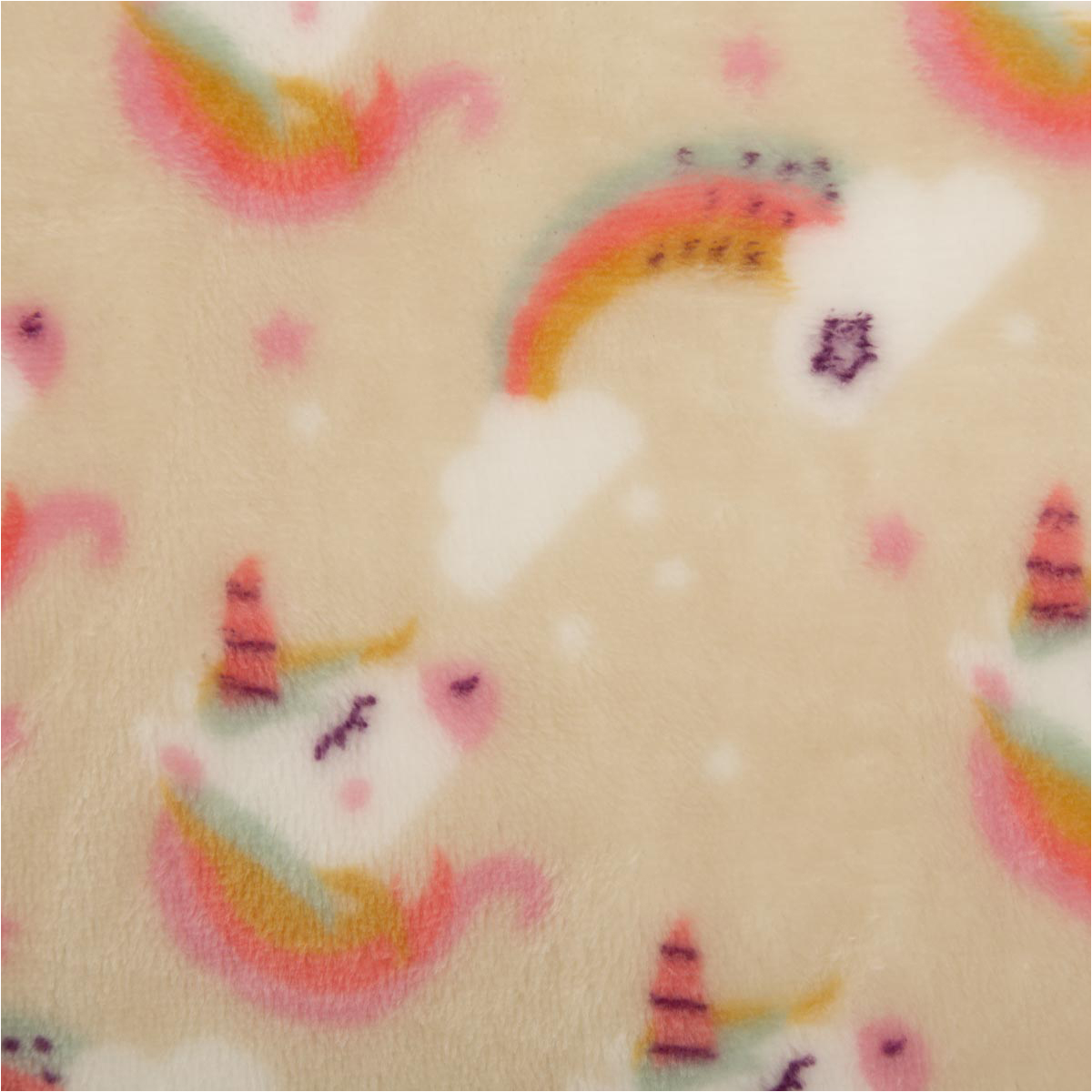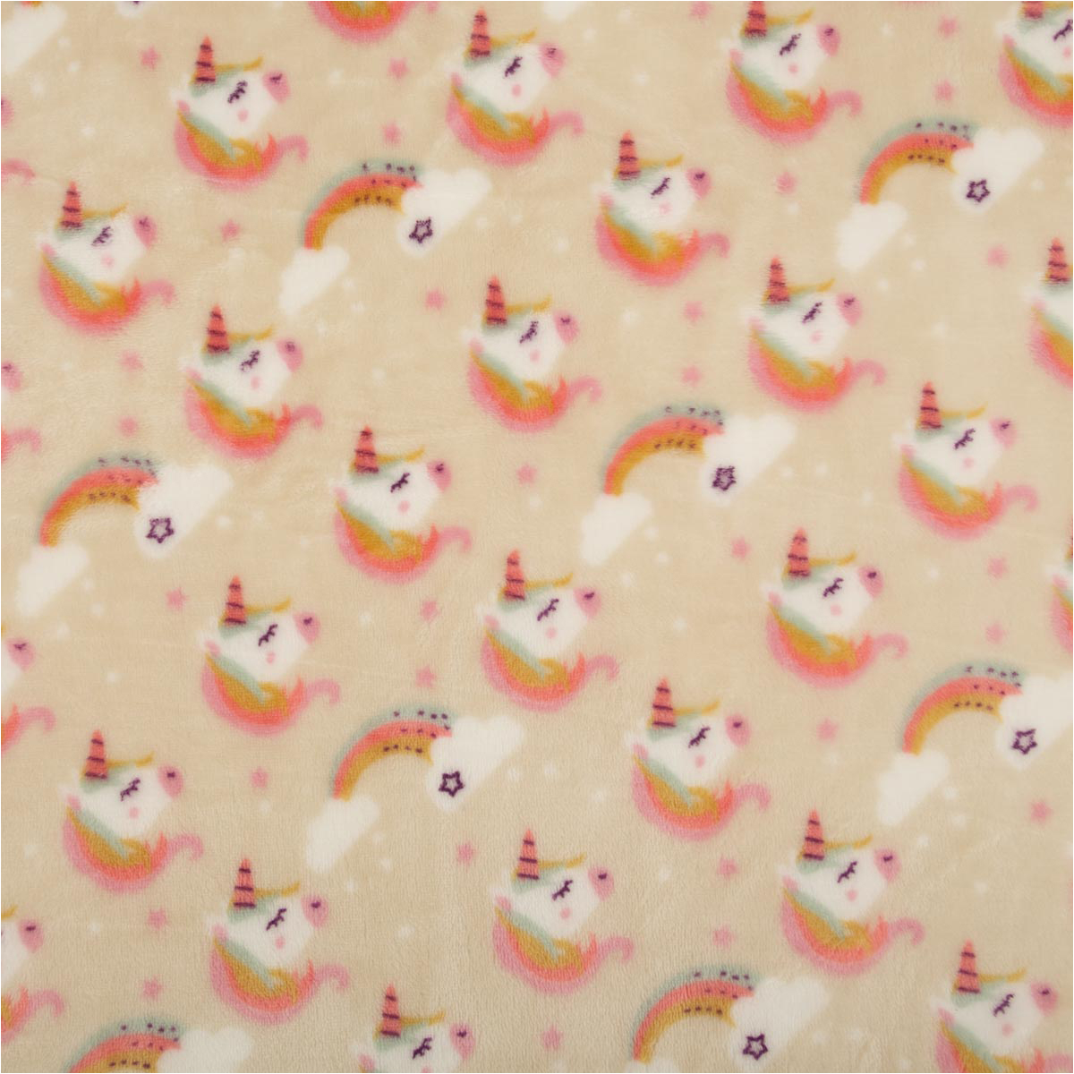 Kuschelweicher Fleecestoff mit Einhörnern und Regenbögen in Beige und Rosa