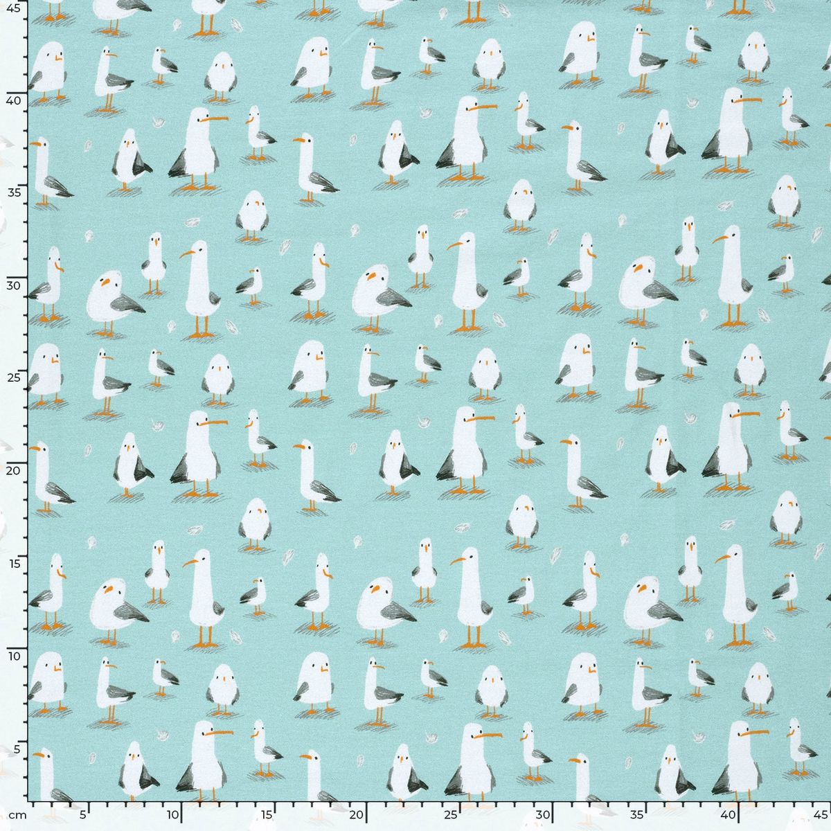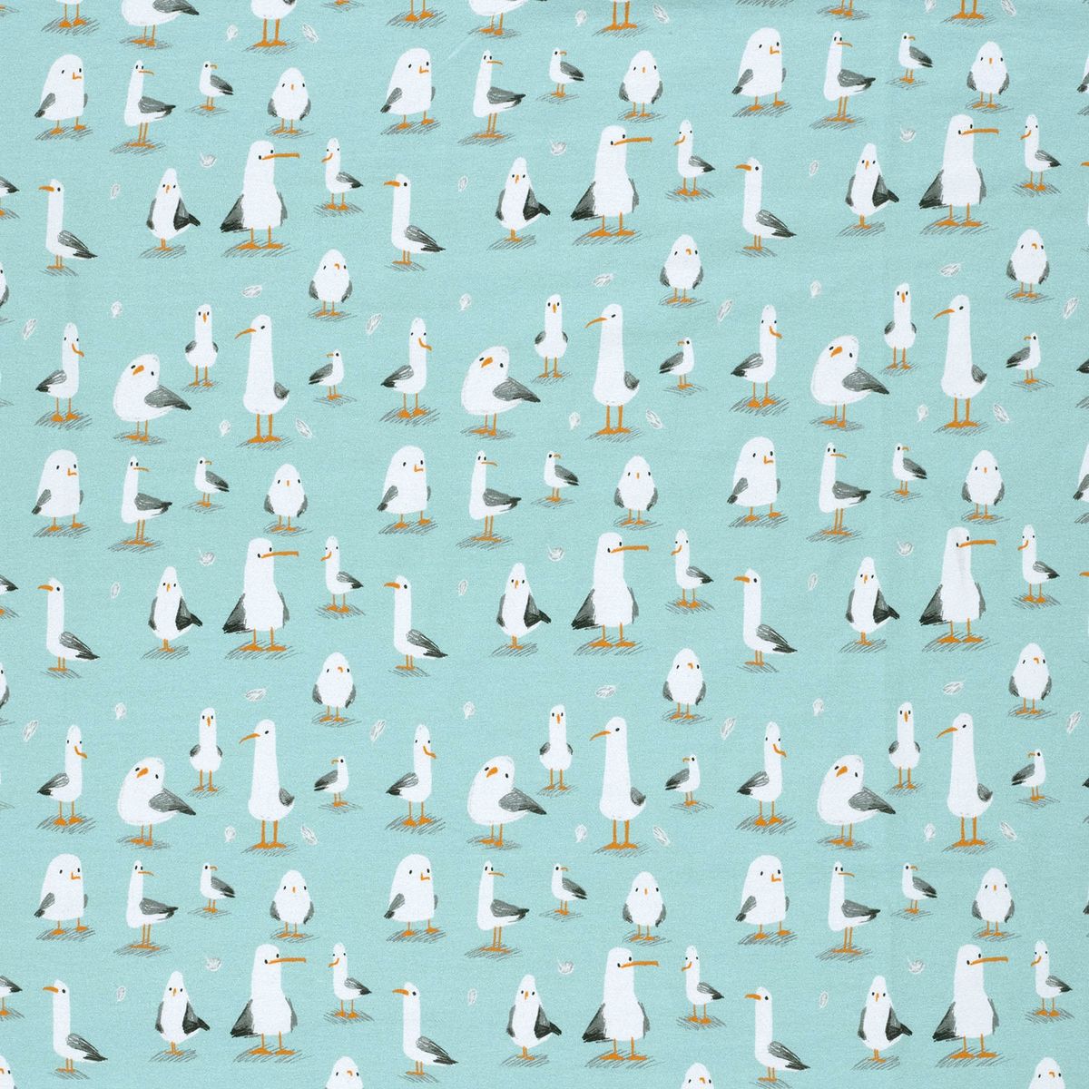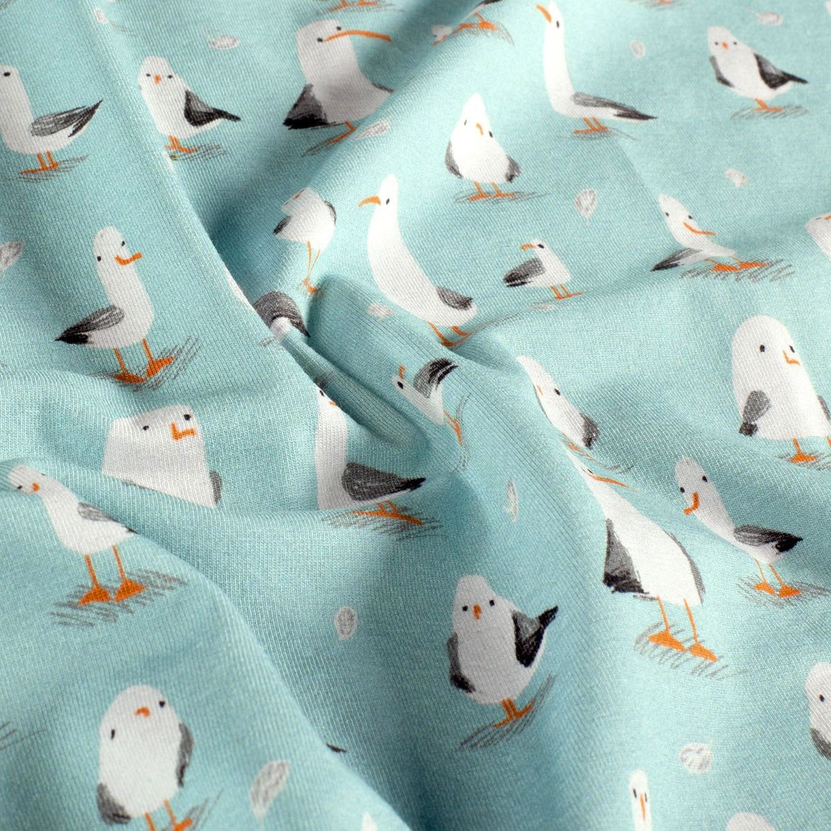 Baumwolljersey ist beliebt, weil er weich, dehnbar und hautangenehm ist. Genau diese Eigenschaften machen ihn zu einem idealen Stoff für bequeme Kleidung und viele kreative Nähideen für Groß und Klein. Durch den digitalen Druck wirkt das Möwenmotiv klar, freundlich und detailreich.