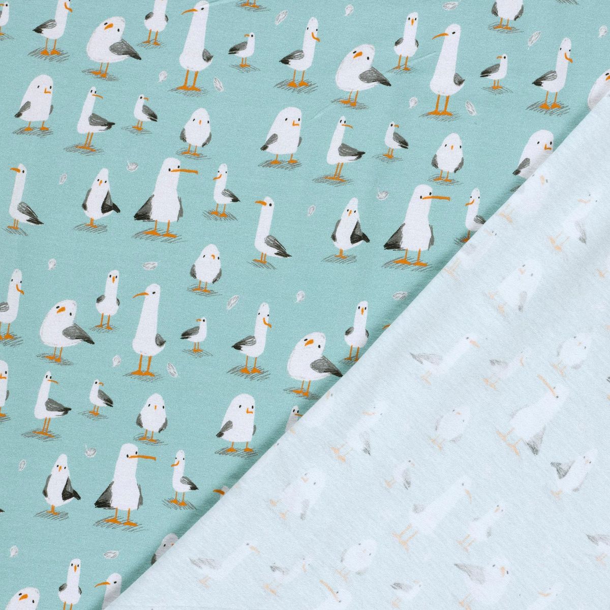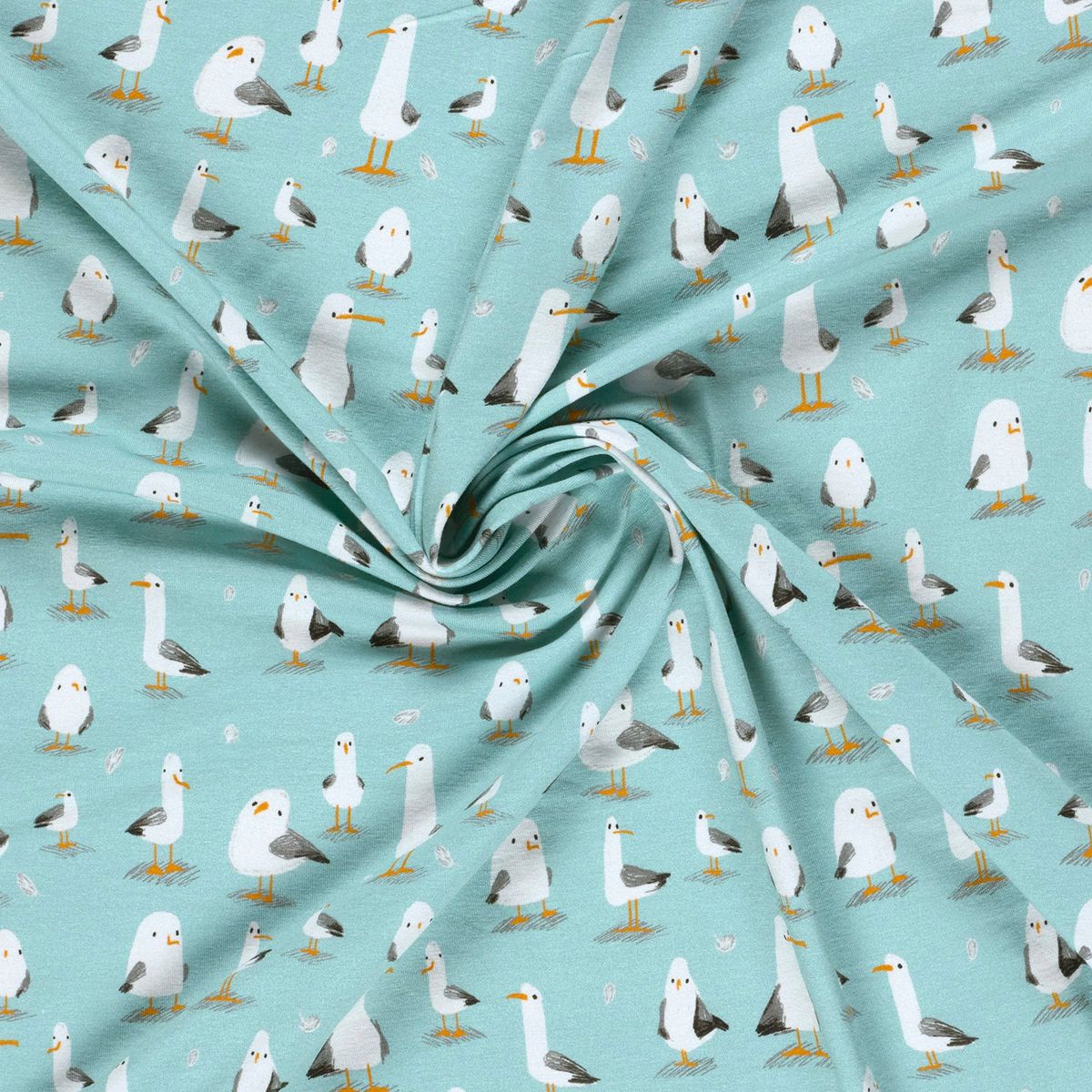 MARITIMES MÖWENMUSTER: Digital bedruckter Jersey mit weißen Möwen auf hellblauem Hintergrund für moderne, frische und kindgerechte Nähprojekte
