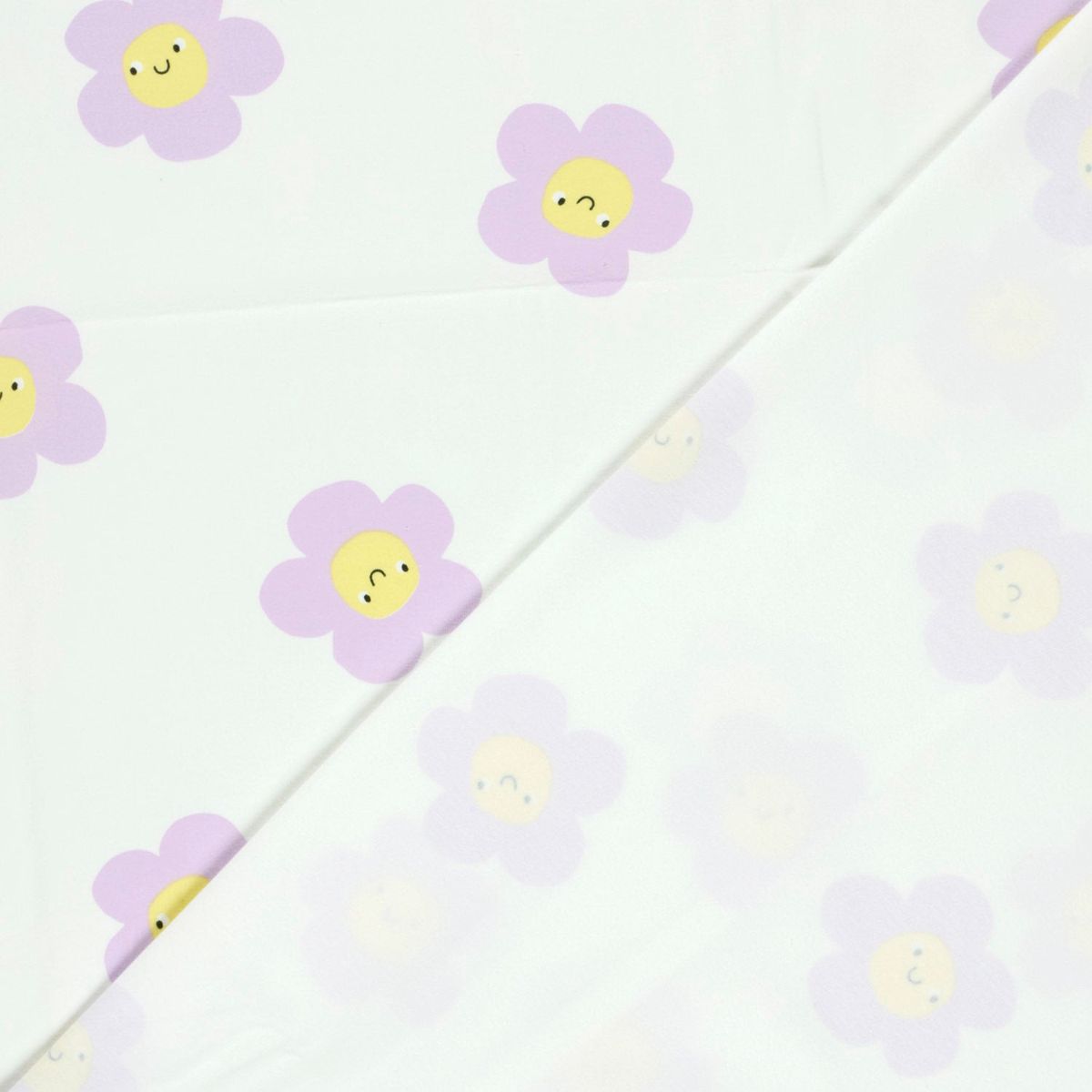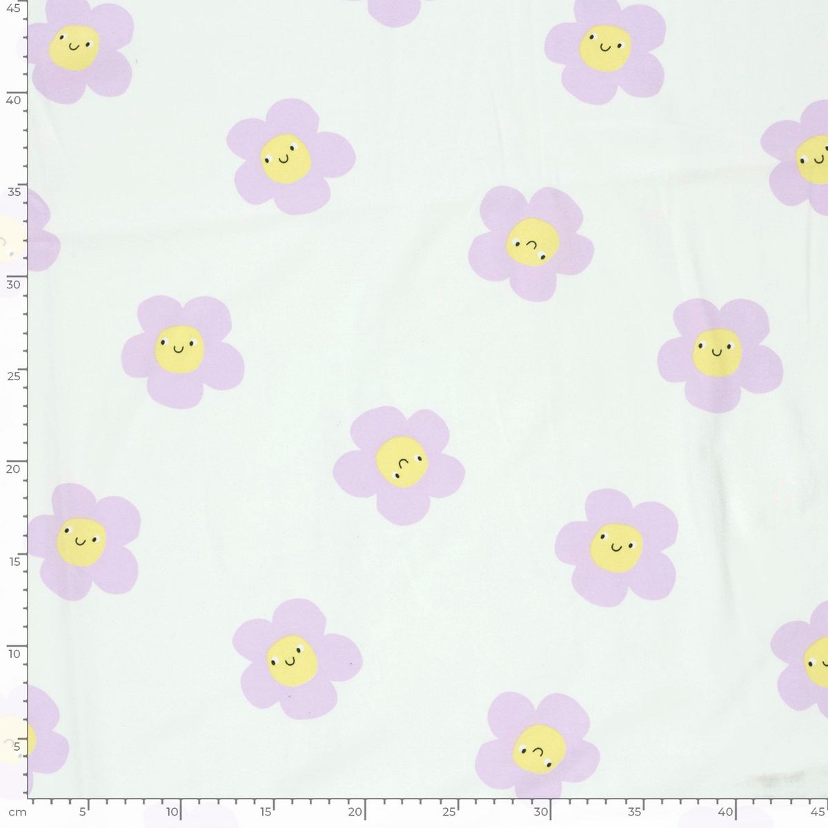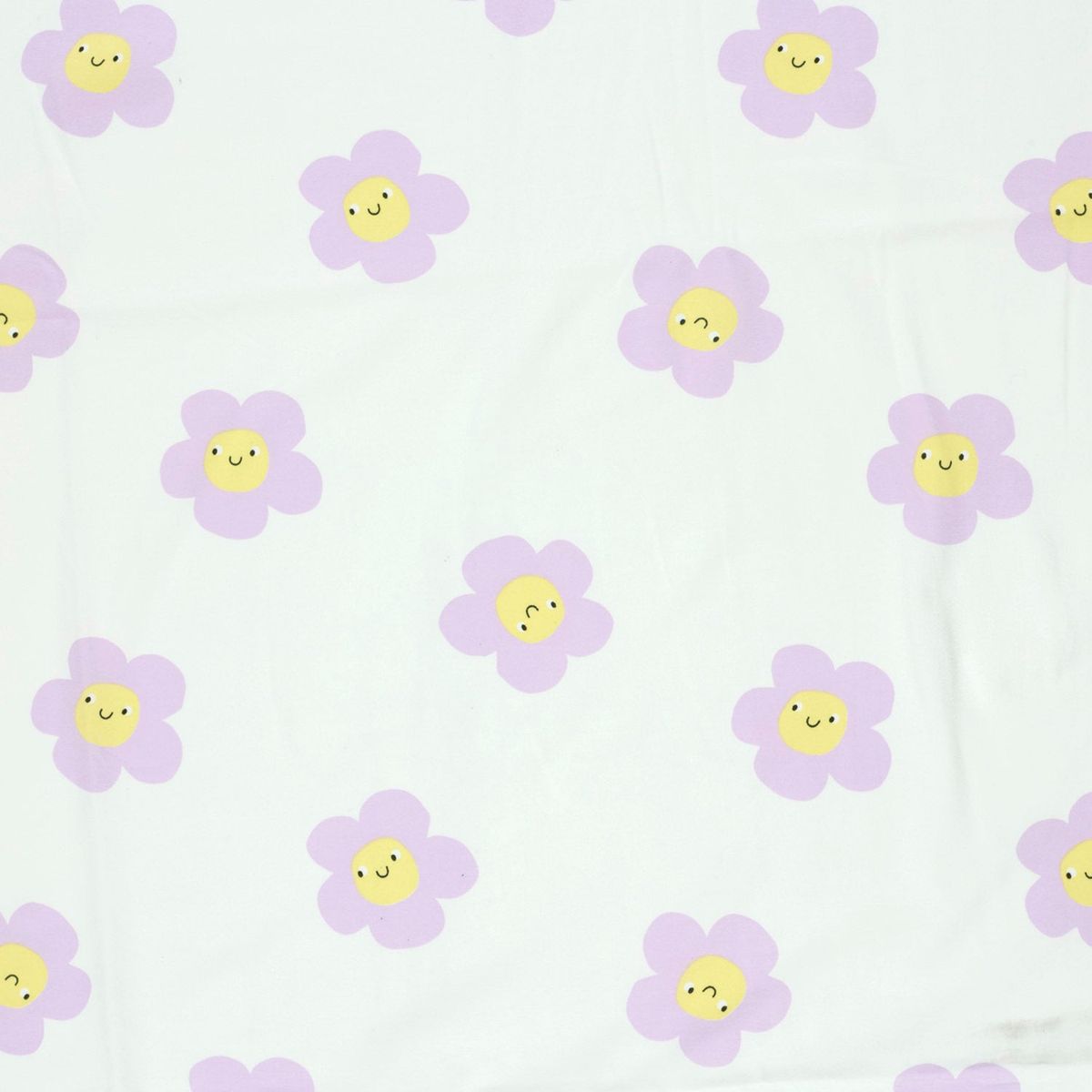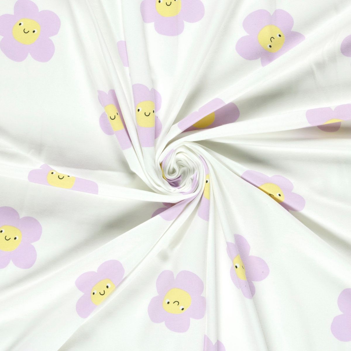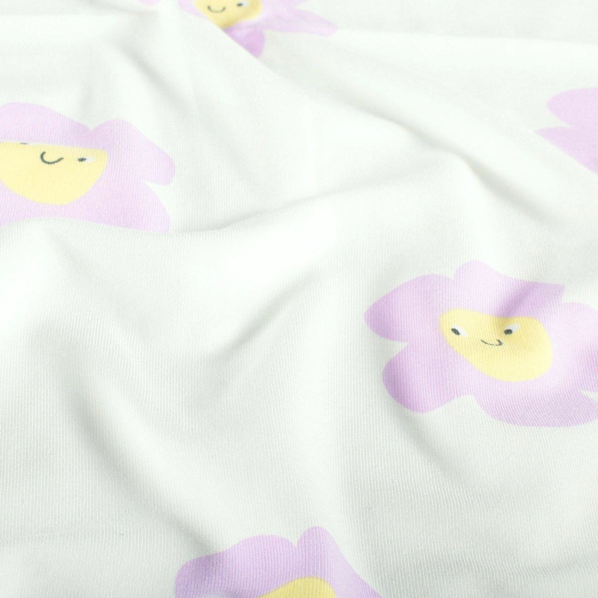 FREUNDLICHES DESIGN: Der Baumwolljersey besticht durch ein modernes Blumen-Smile-Muster in Lila auf wollweißem Grund, das gute Laune in jedes Nähprojekt bringt.