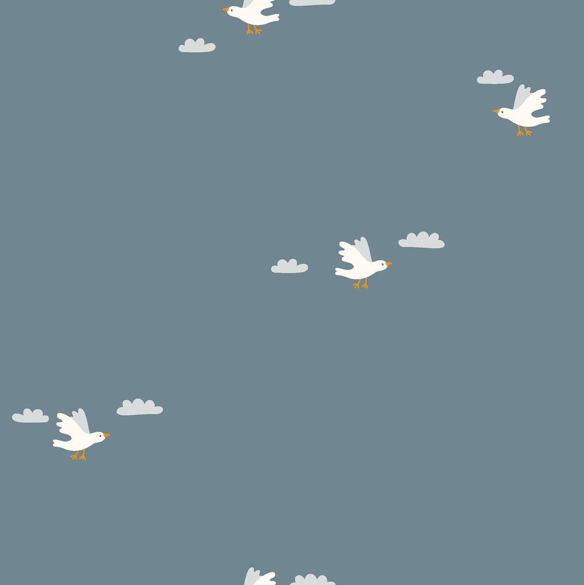 Verspieltes Design mit weißen Vögeln & Wolken auf blauem Grund