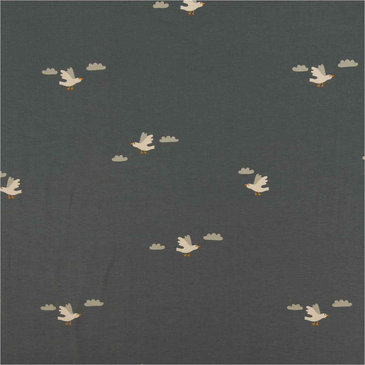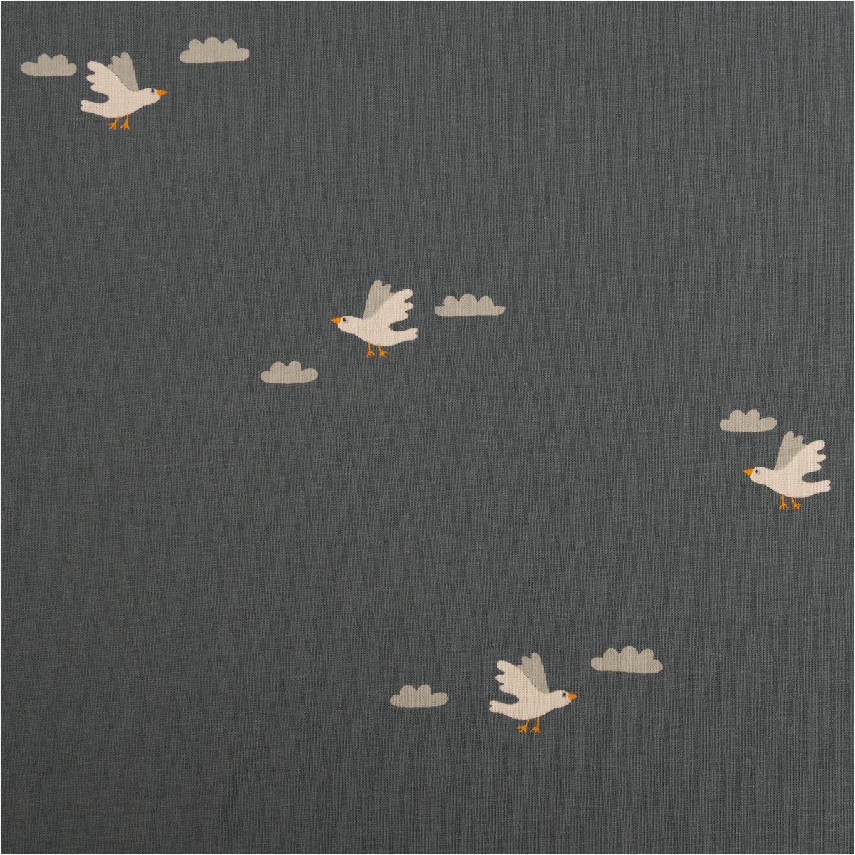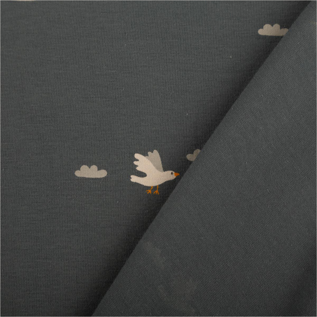 Baumwolljersey Vögel blau – weicher Jersey Stoff mit Wolken für Baby- & Kinderkleidung