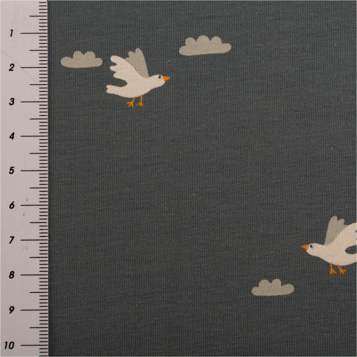 Jersey Stoff Baumwolljersey Vögel Wolken blau weiß 1,50m Breite
