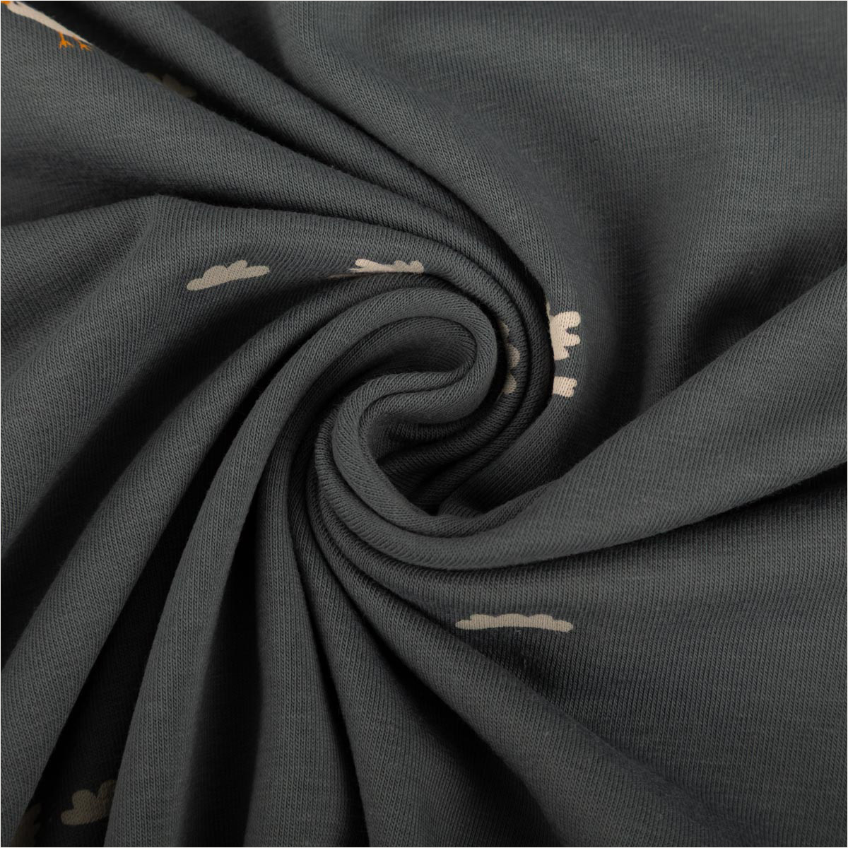 Dieser Baumwolljersey mit kleinen Vögeln und Wolken auf blauem Hintergrund bringt frischen Wind in deine Nähideen. Durch den hohen Baumwollanteil ist der Stoff weich, atmungsaktiv und hautfreundlich, während der Elasthananteil für angenehme Dehnbarkeit sorgt. Ideal für Kinder-, Baby- und Freizeitkleidung!