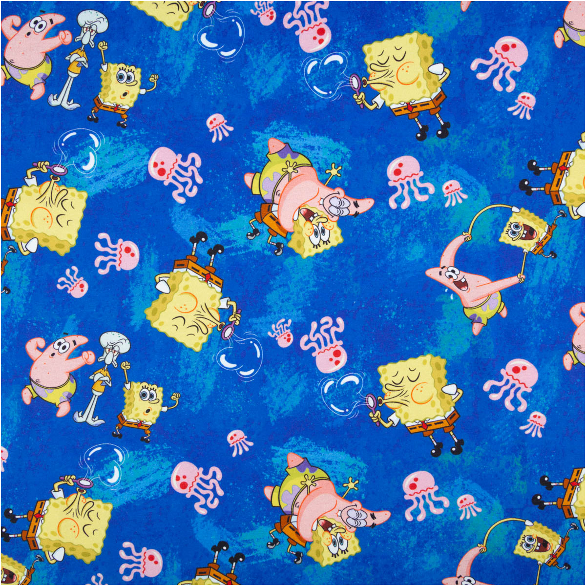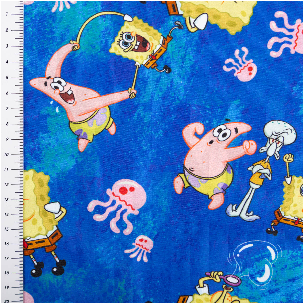 Tauche ab in die bunte Unterwasserwelt von Bikini Bottom! Dieser offiziell lizensierte Jersey Stoff SpongeBob blau zeigt SpongeBob, Patrick, Thaddäus und viele Quallen in einem lebendigen Comic-Design auf strahlend blauem Hintergrund.
