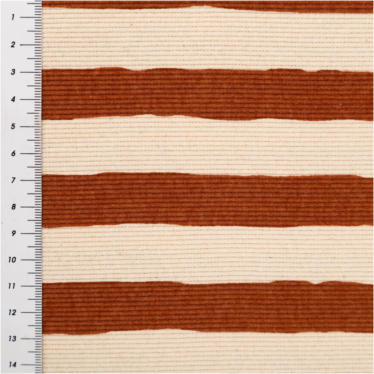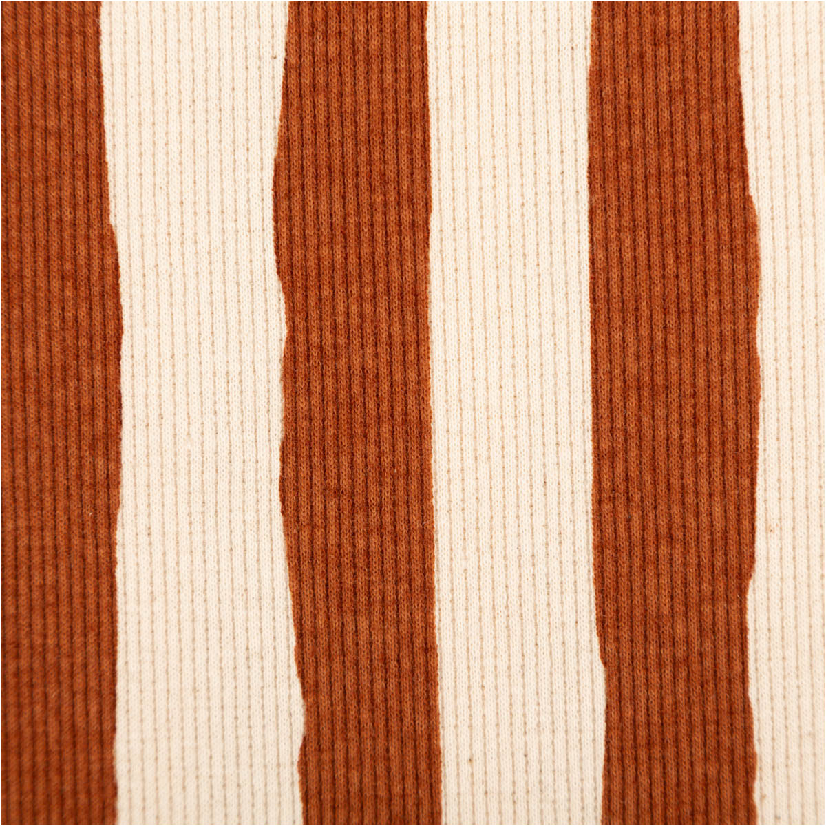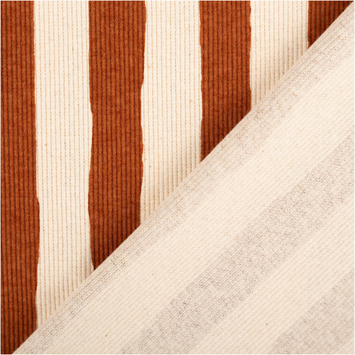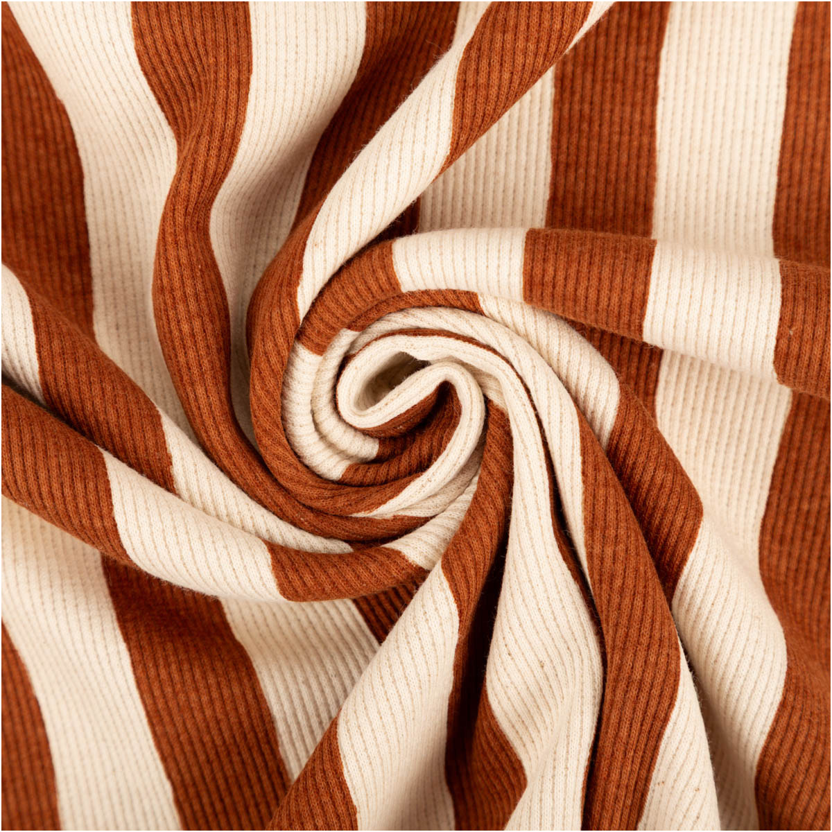 Dieser Bio Rippjersey aus Baumwolle mit braunen Streifen auf naturfarbenem Grund ist ein vielseitiger Stoff für bequeme und langlebige Nähprojekte. Die feine Rippenstruktur sorgt für eine moderne Optik und eine angenehm weiche Haptik. Durch den Elasthan-Anteil ist der Rib Jersey leicht dehnbar, bleibt dabei aber formstabil – ideal für Baby-, Kinder- und Erwachsenenmode.