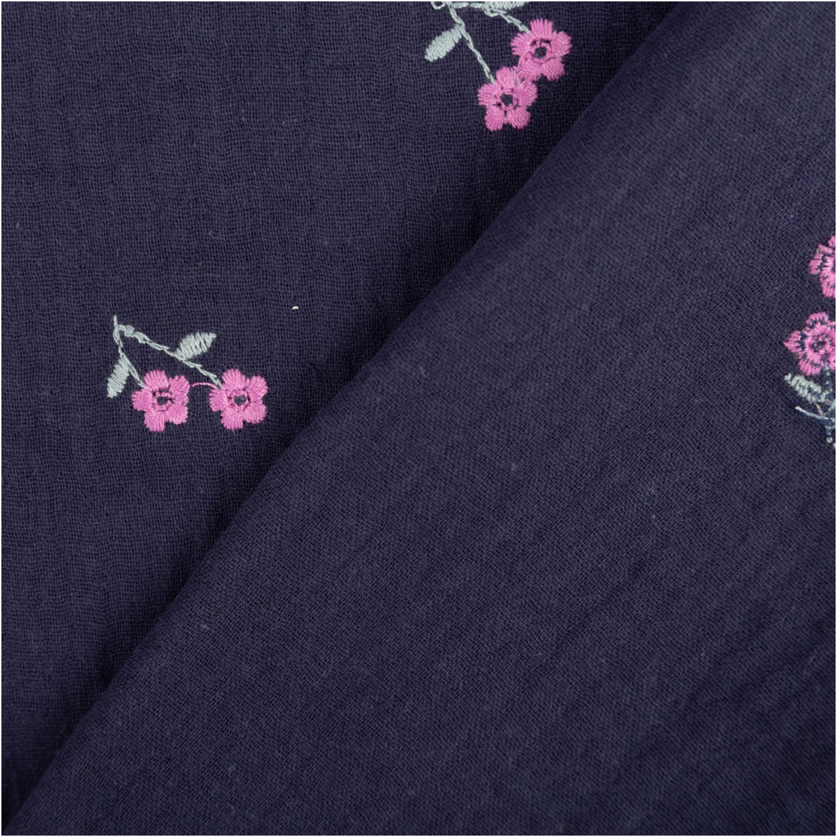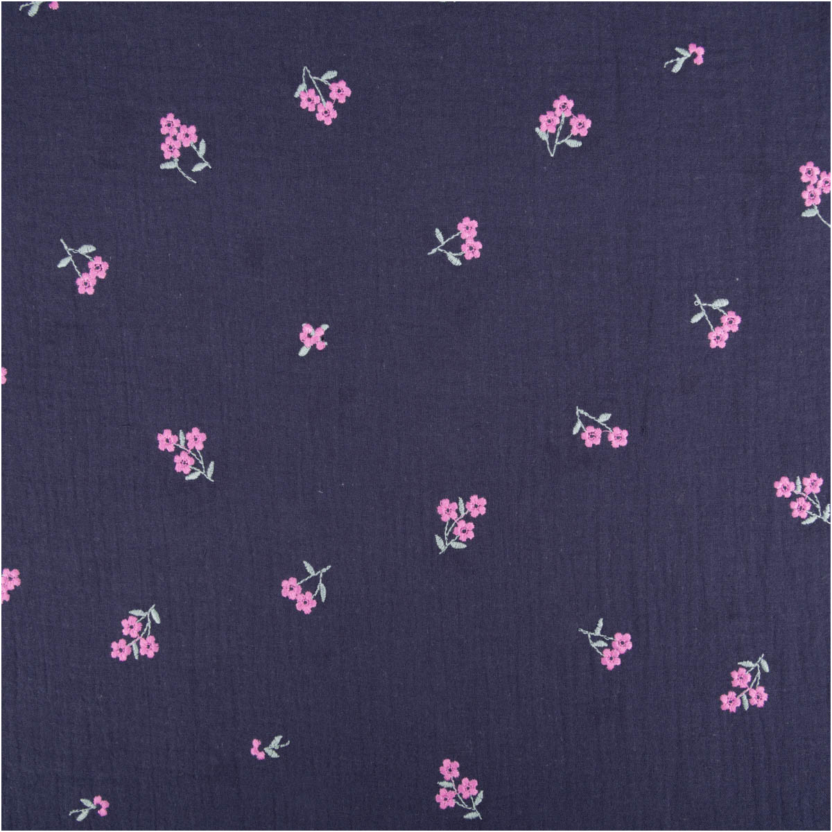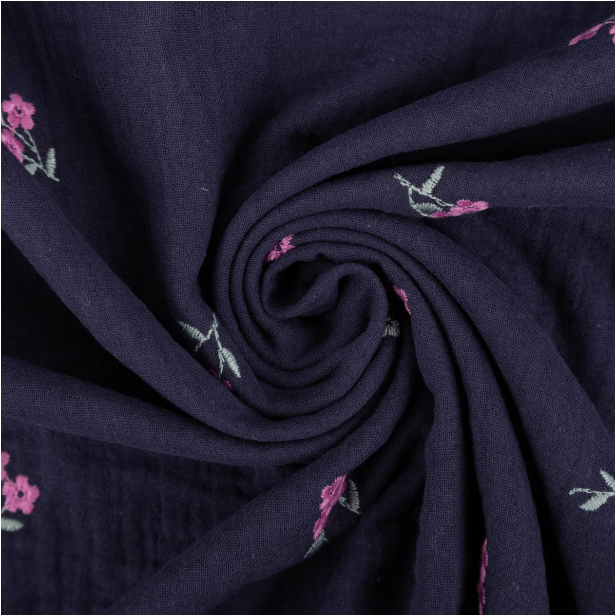 Weicher Musselin Stoff Double Gauze in Marineblau mit feiner rosa Blümchen Stickerei für liebevolle und hochwertige Nähideen
