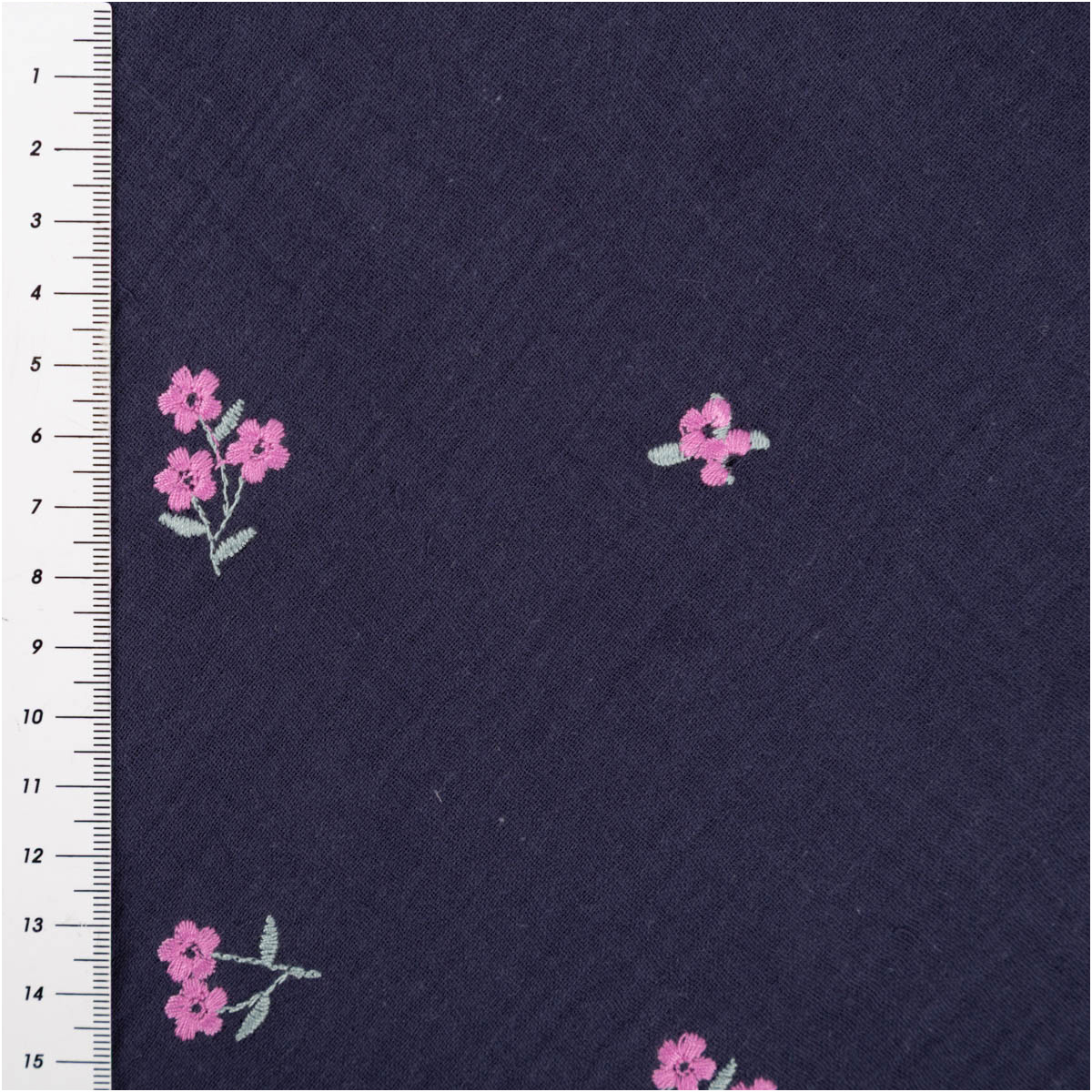 Musselin Stoff mit Blümchen Stickerei in Marineblau und Rosa